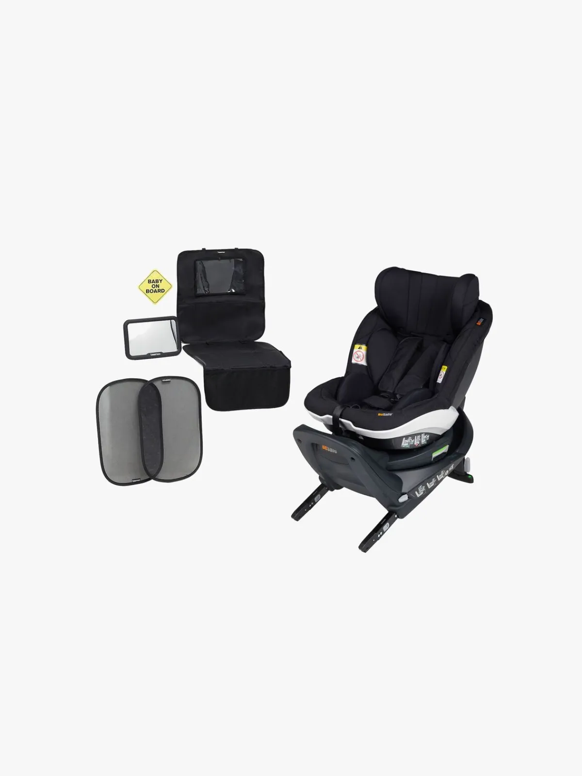 Autostolspakke fra Beemoo med fire stk. tilbehør. Pakken består af et bilspejl med et brudsikkert beslag, sædebeskyttelse i mikrofiber og læder, et ”baby on board”-skilt samt to solskærme, der beskytter dit barn mod solens stråler.