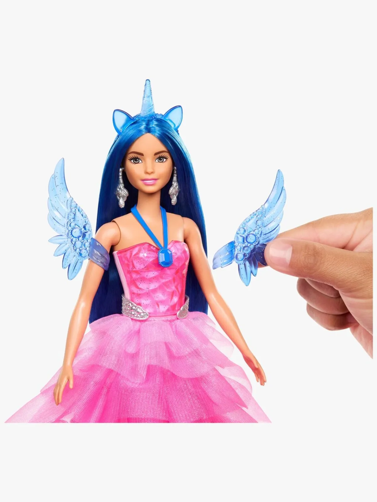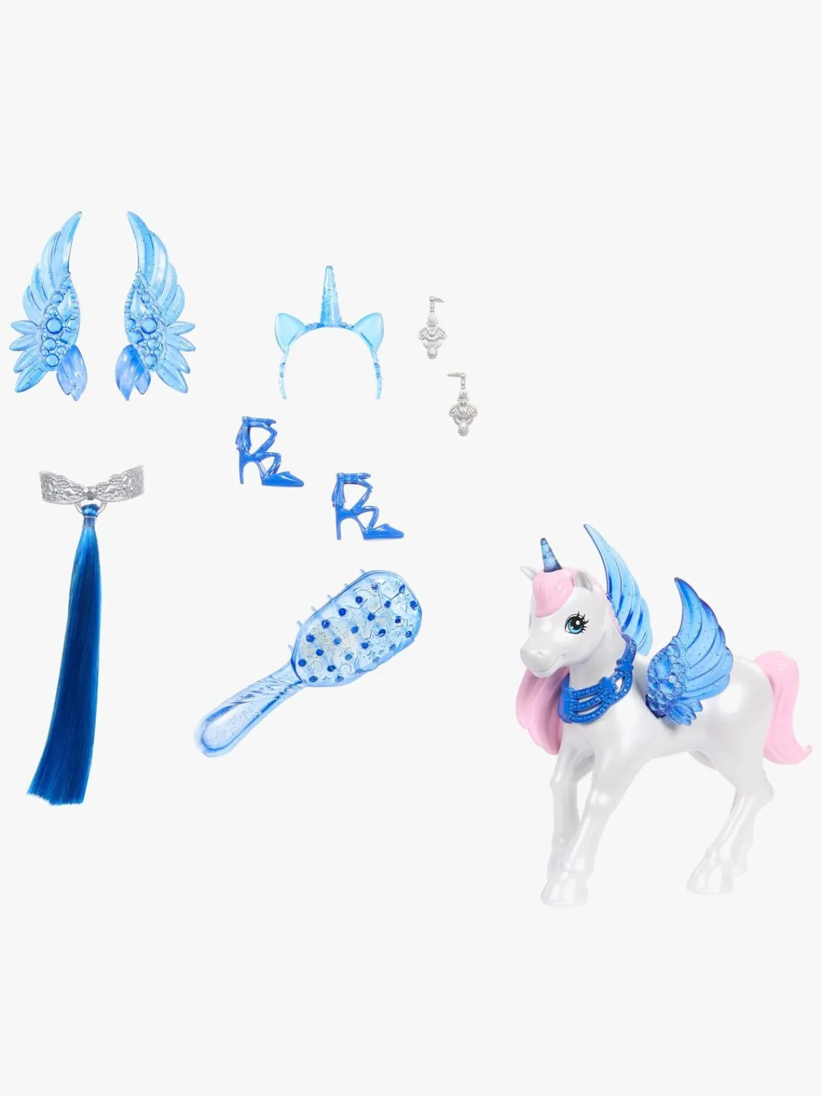 – Indeholder: 1 dukke, 1 outfit, 1 par vinger, 1 par øreringe, 1 par sko, 1 hårbånd, 1 børste, 1 enhjørning.