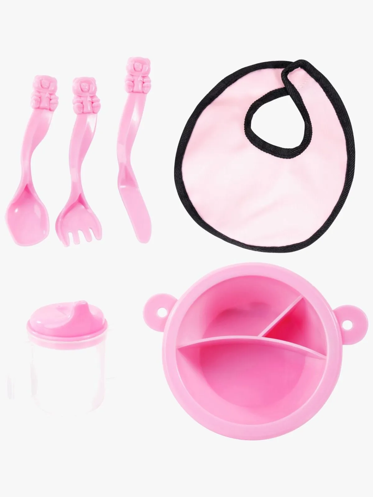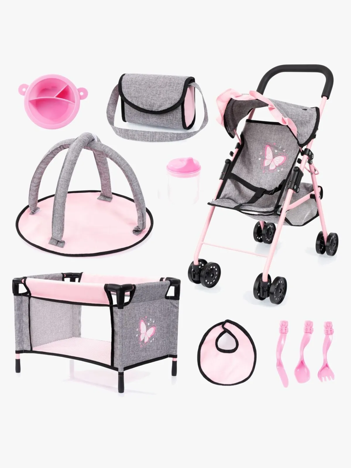 – Indeholder: 1 dukkevogn, 1 pusletaske, 1 dukkeseng, 1 sovepose, 1 aktivitetstæppe, 1 tallerken, 1 ske, 1 gaffel, 1 kniv, 1 tudekop.