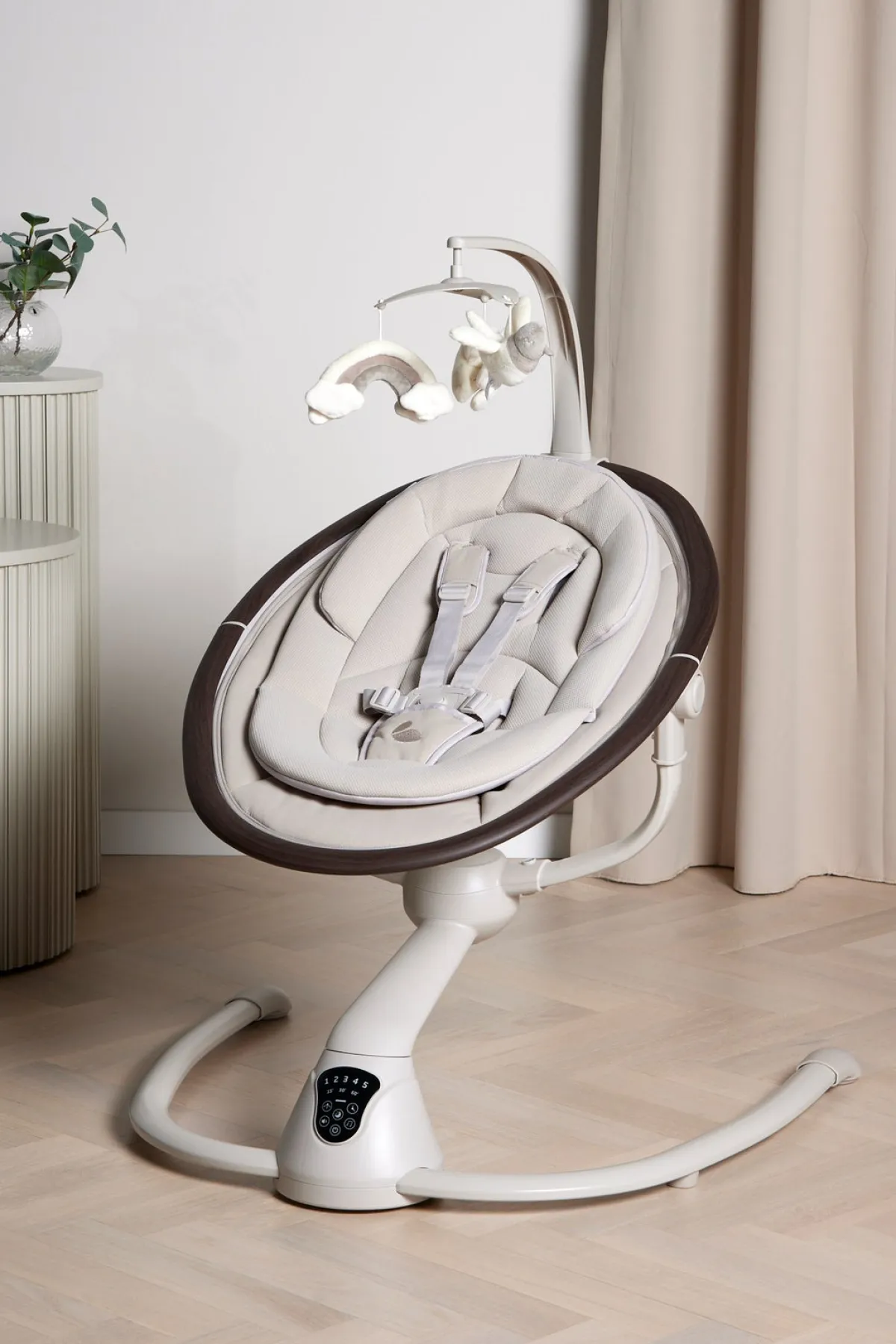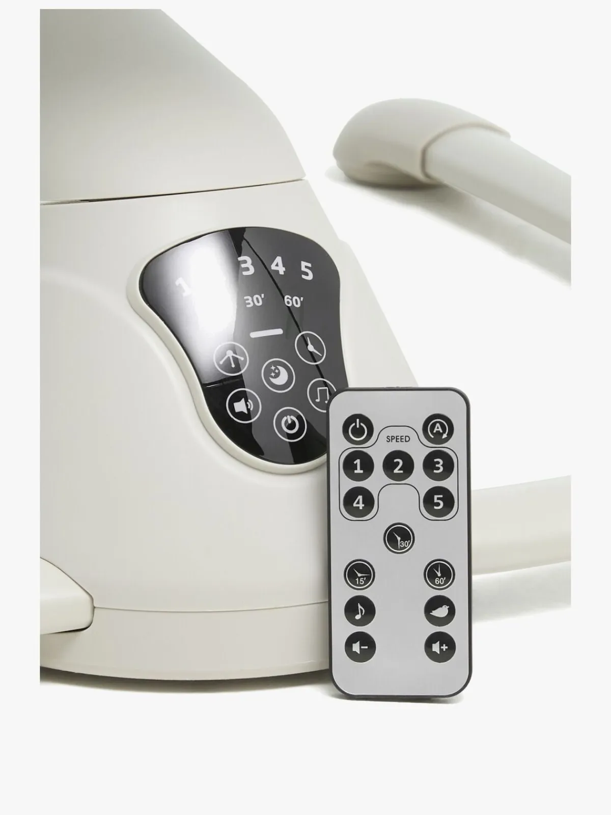 – Fjernkontrol medfølger til justering af gynge- og musikfunktion.
