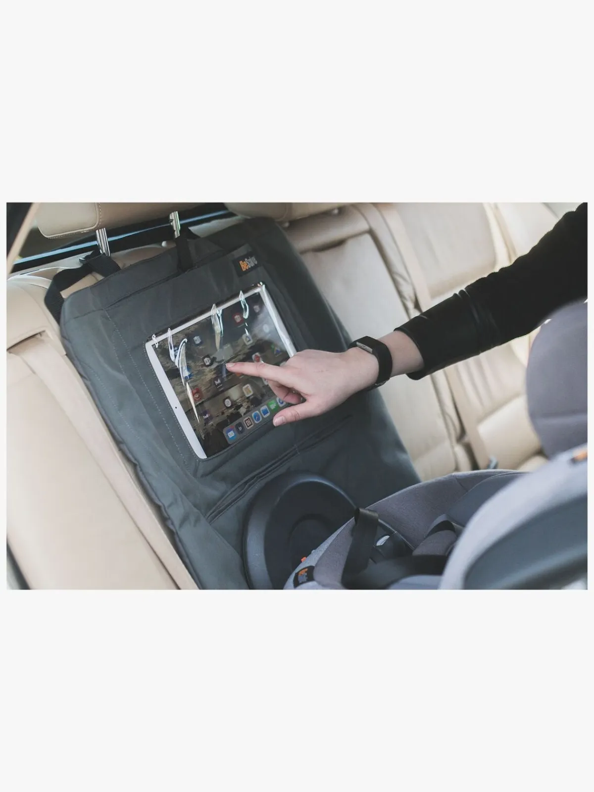 Sædebeskytteren har en smart gennemsigtig lomme til en tablet og små mindre lommer med velcrolukning, hvor der kan blive plads til opbevaring af alle småtingene. Praktisk og smart når hele familien skal på tur!