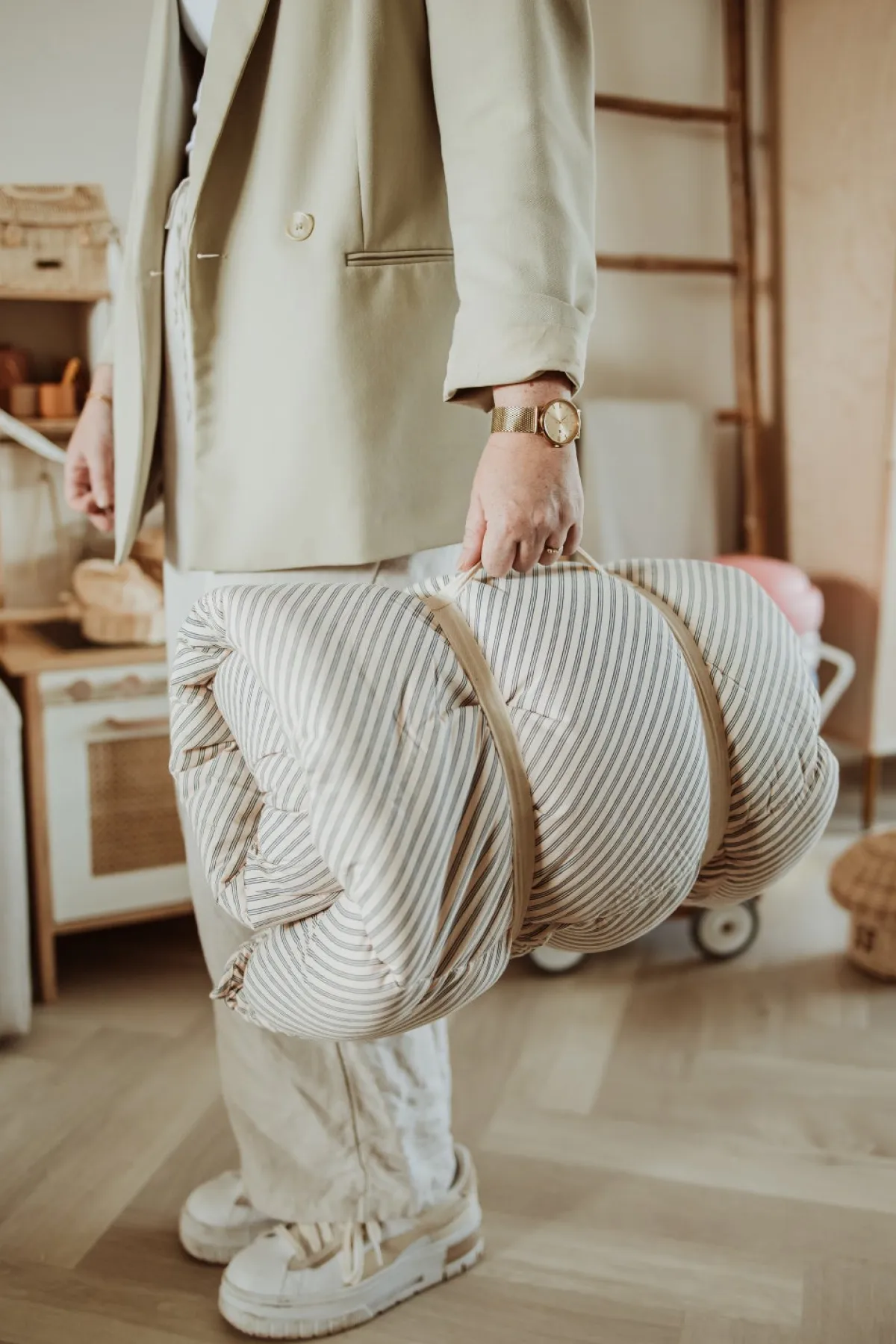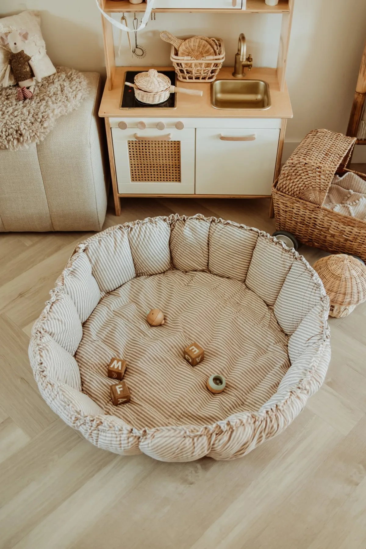 – Kanterne på legetæppet kan foldes op for at skabe en hyggelig babynest.