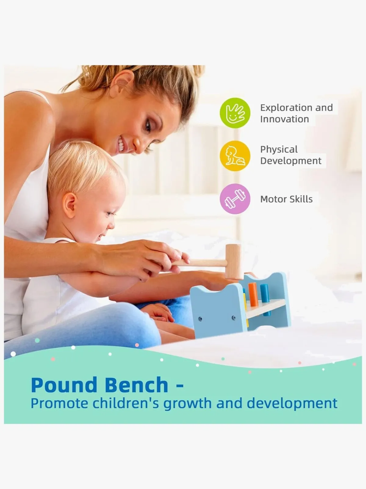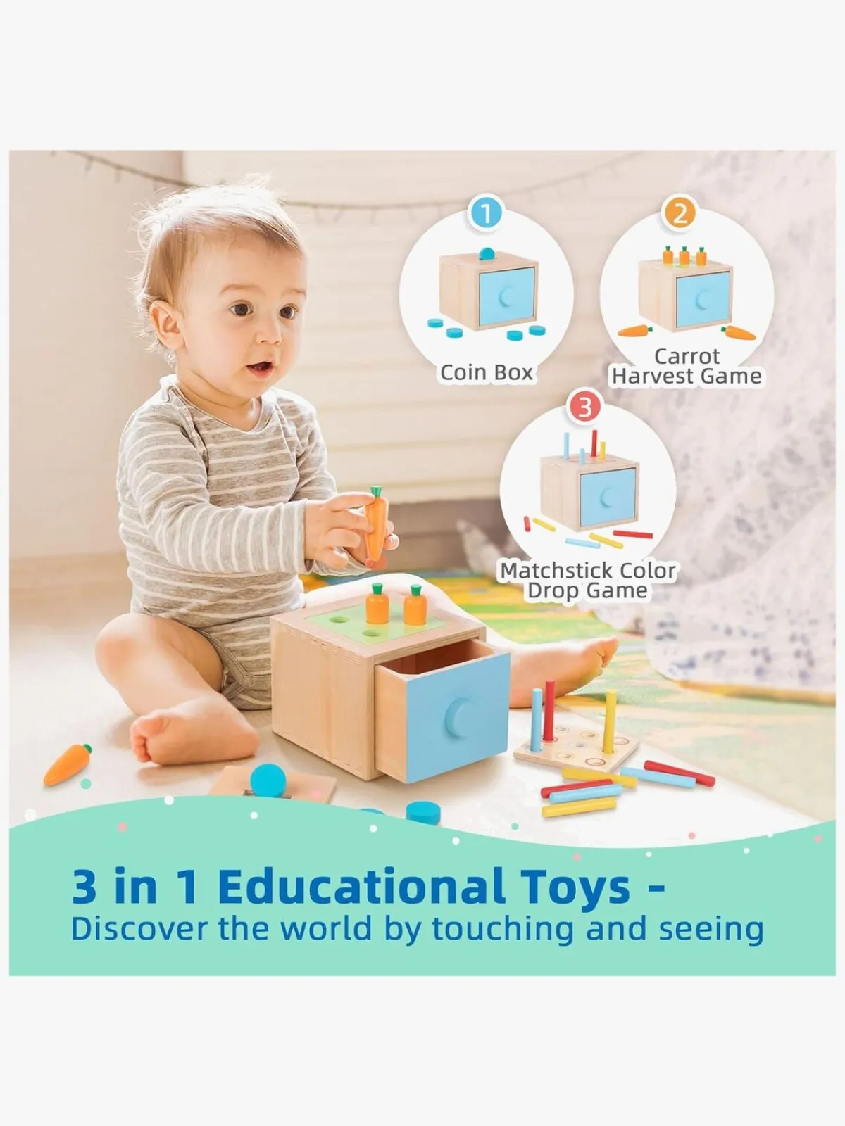 – Indeholder: 1 stk. 3-i-1 pædagogisk montessori-legetøj, 1 billedbog, 1 sæt stablekopper, 1 fleksibel træstabler, 1 formpuslespil, 1 hammerbræt og 1 brugsvejledning.