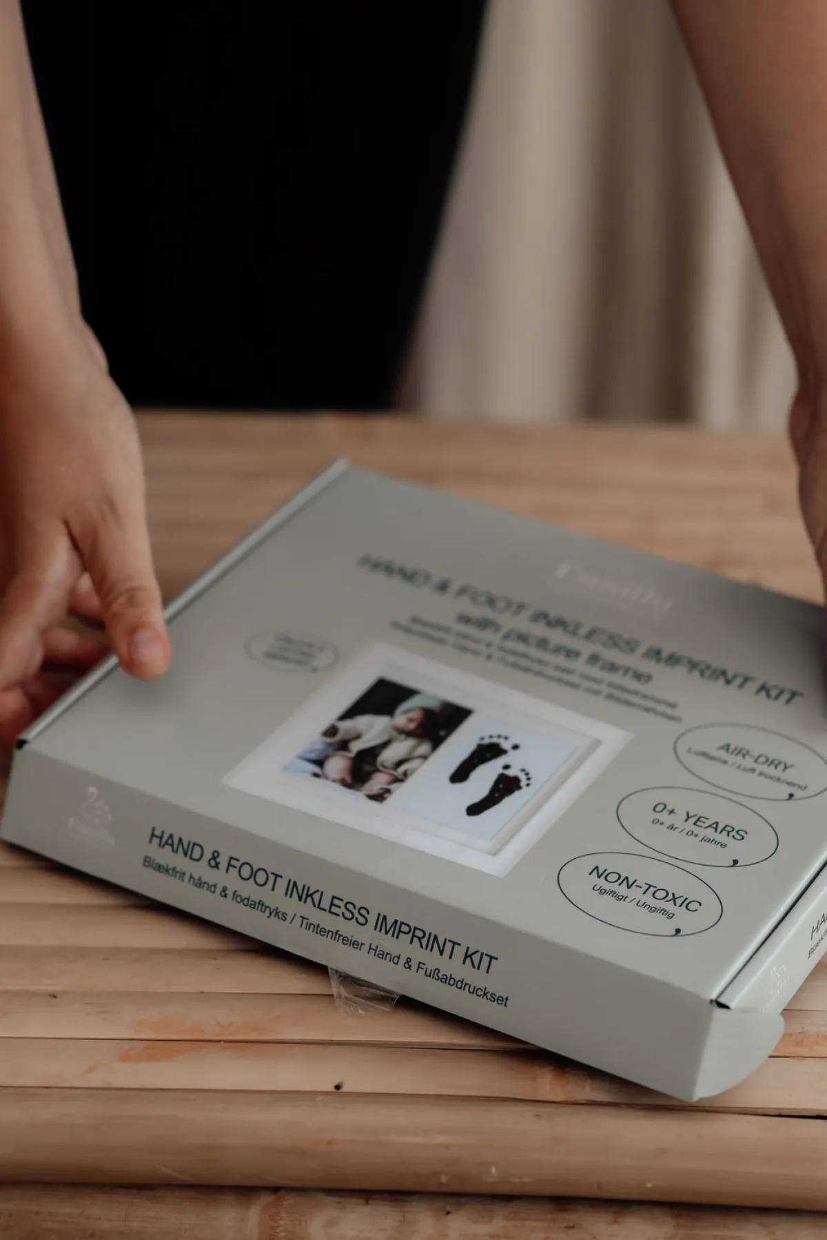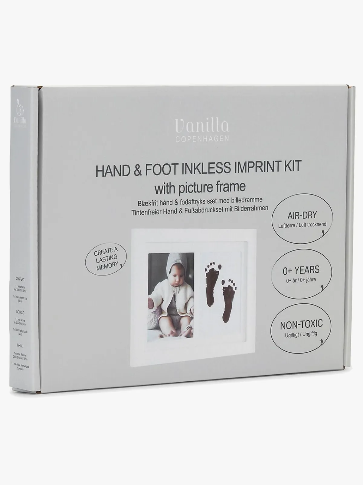 – Komplet sæt med alt, hvad du skal bruge for at lave et aftryk af barnets fod eller hånd derhjemme.