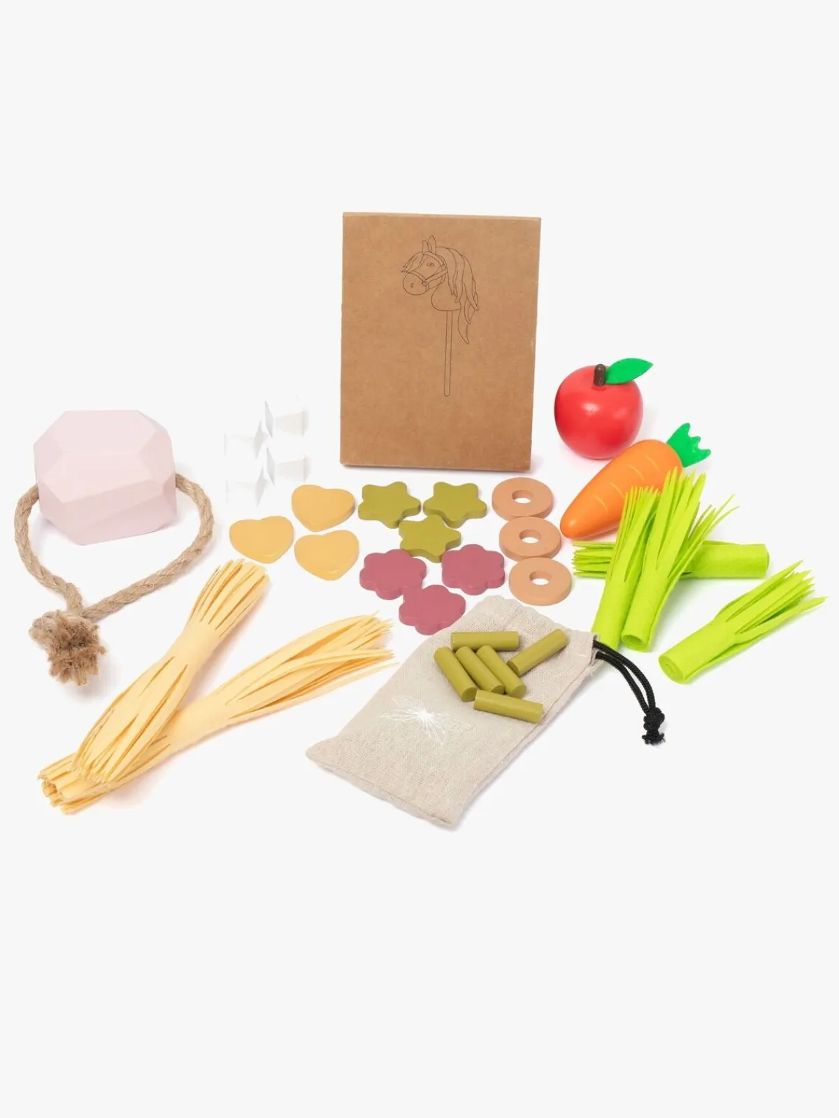 – Indeholder: 2 halmbundter, 4 Græsbundter, 1 Saltsten, 1 gulerod, 1 æble, 4 sukkerknalder, 6 hestepiller med en opbevaringspose, 12 Hestegodbidder.