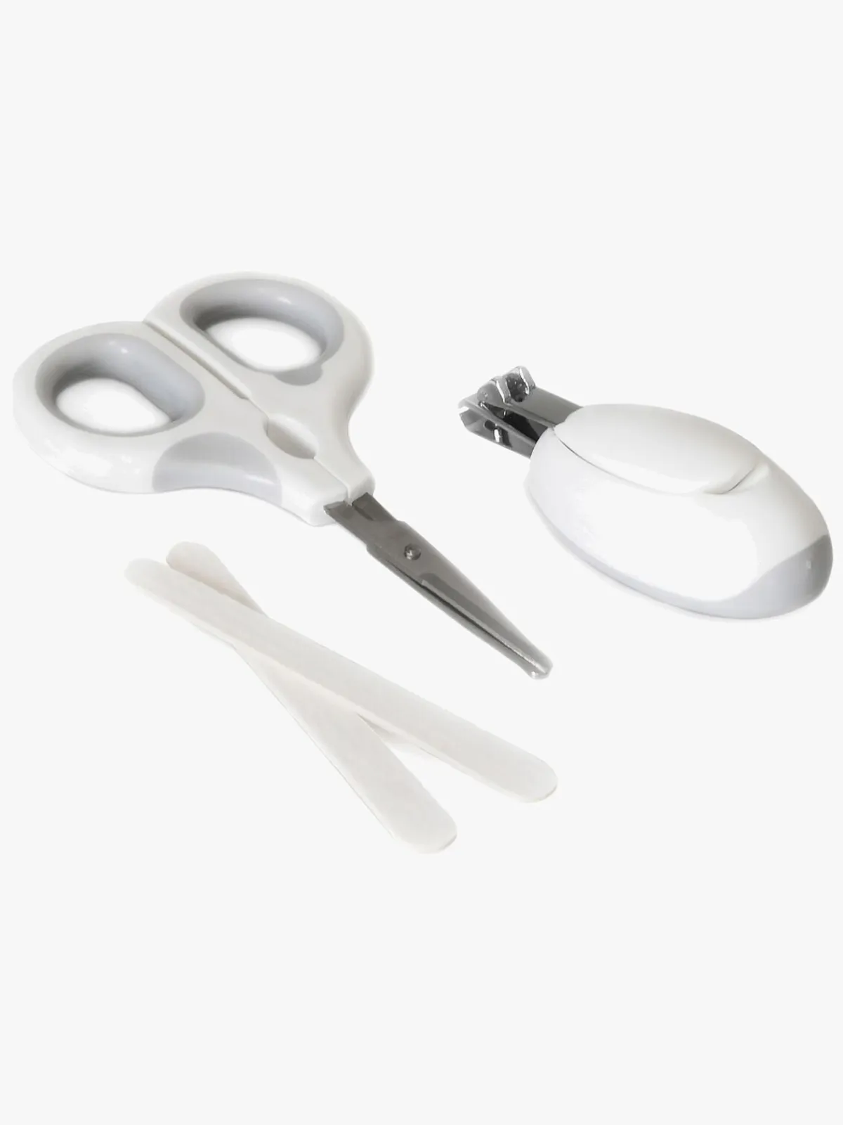 CarloBaby Negleplejesæt, der indeholder: neglesaks, negleklipper og to neglefiler. Alt indhold er tilpasset små børne- og babynegle.