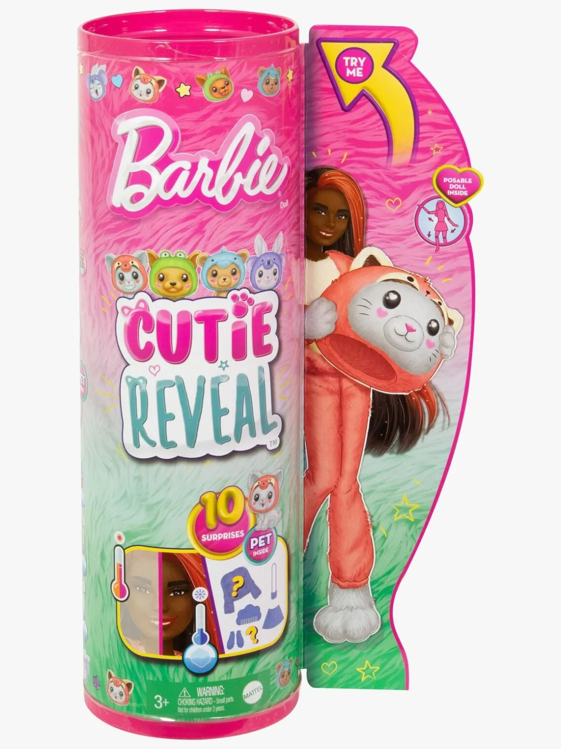 – Indeholder: 1 Barbie Cutie Reveal-dukke, 1 dyredragt, 1 kæledyr, 1 kam, 1 håndtaske, 1 par sko, 1 outfit.