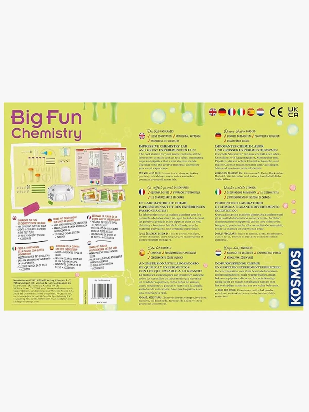 – Indeholder: eksperimentkort, kemistation, Erlenmeyer-kolbe, sprøjte, petriskål, forskellige prøverør, forskellige målebægere, pipetter, spatler, skeer, slange, filterpapir, tragt, slime, bagepulver, farvetabletter, citronsyre, brusetabletter og brugsvejledning.