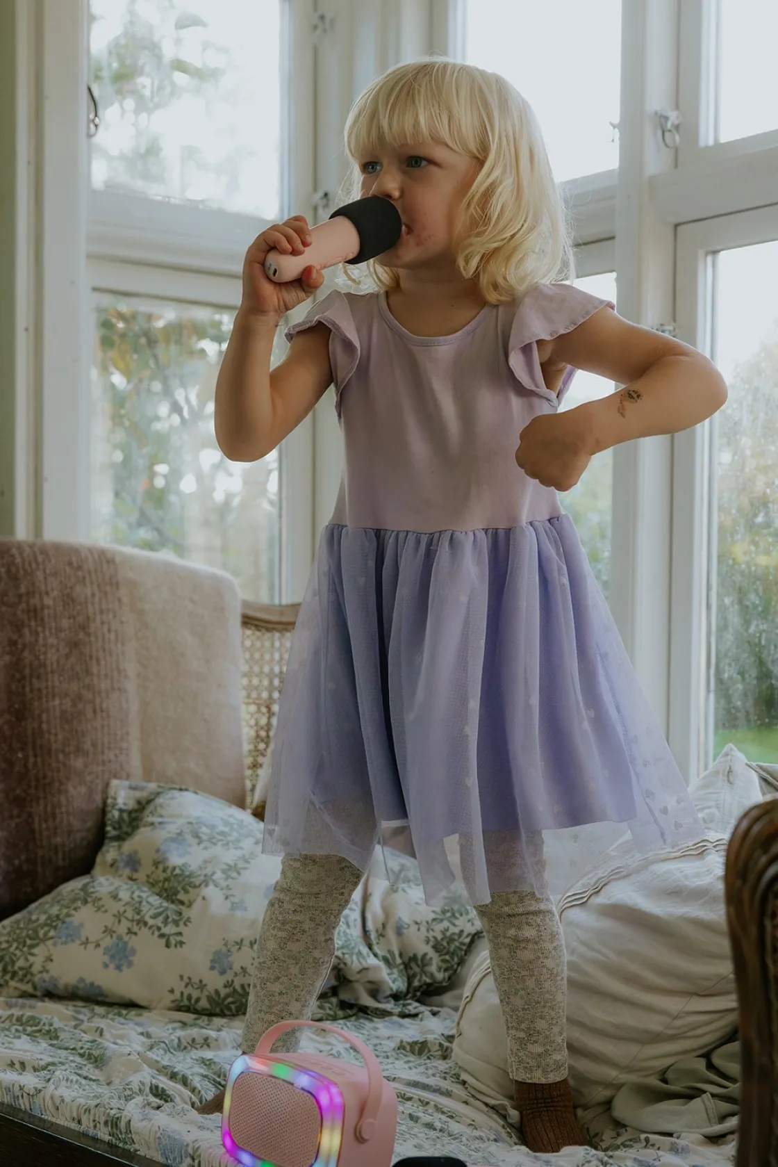 – Indeholder: 1 Bluetooth-højttaler, 2 mikrofoner, 1 USB-C kabel, 1 opbevaringspose.