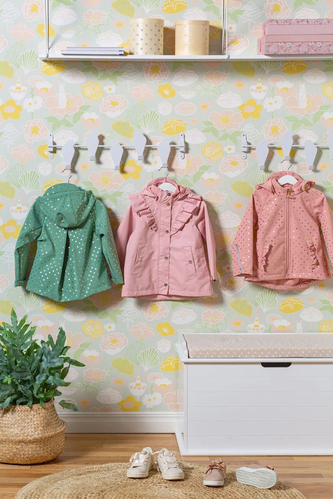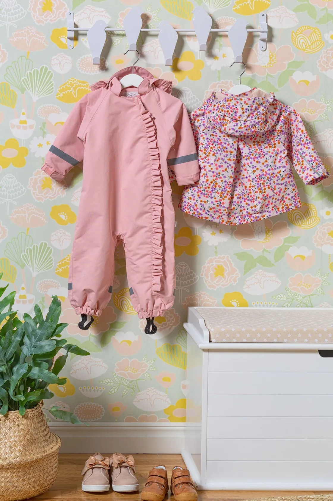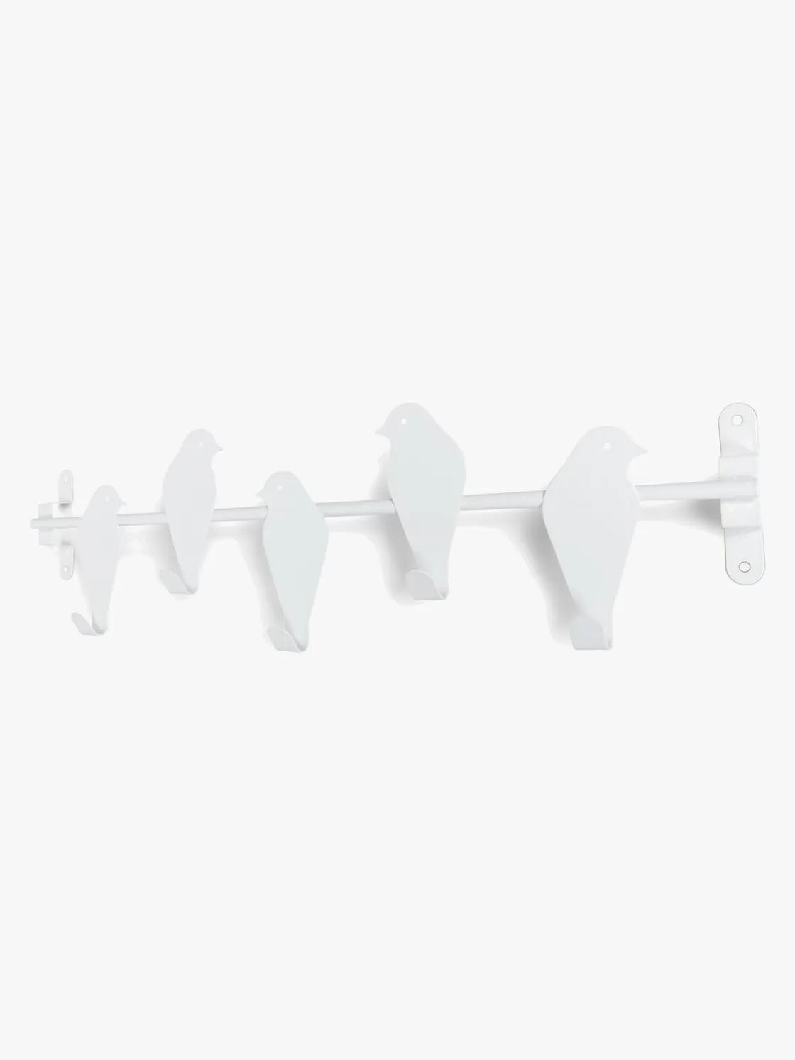 Knagerækken er i metal og udformet som en række søde fugle, der sidder på en stang.