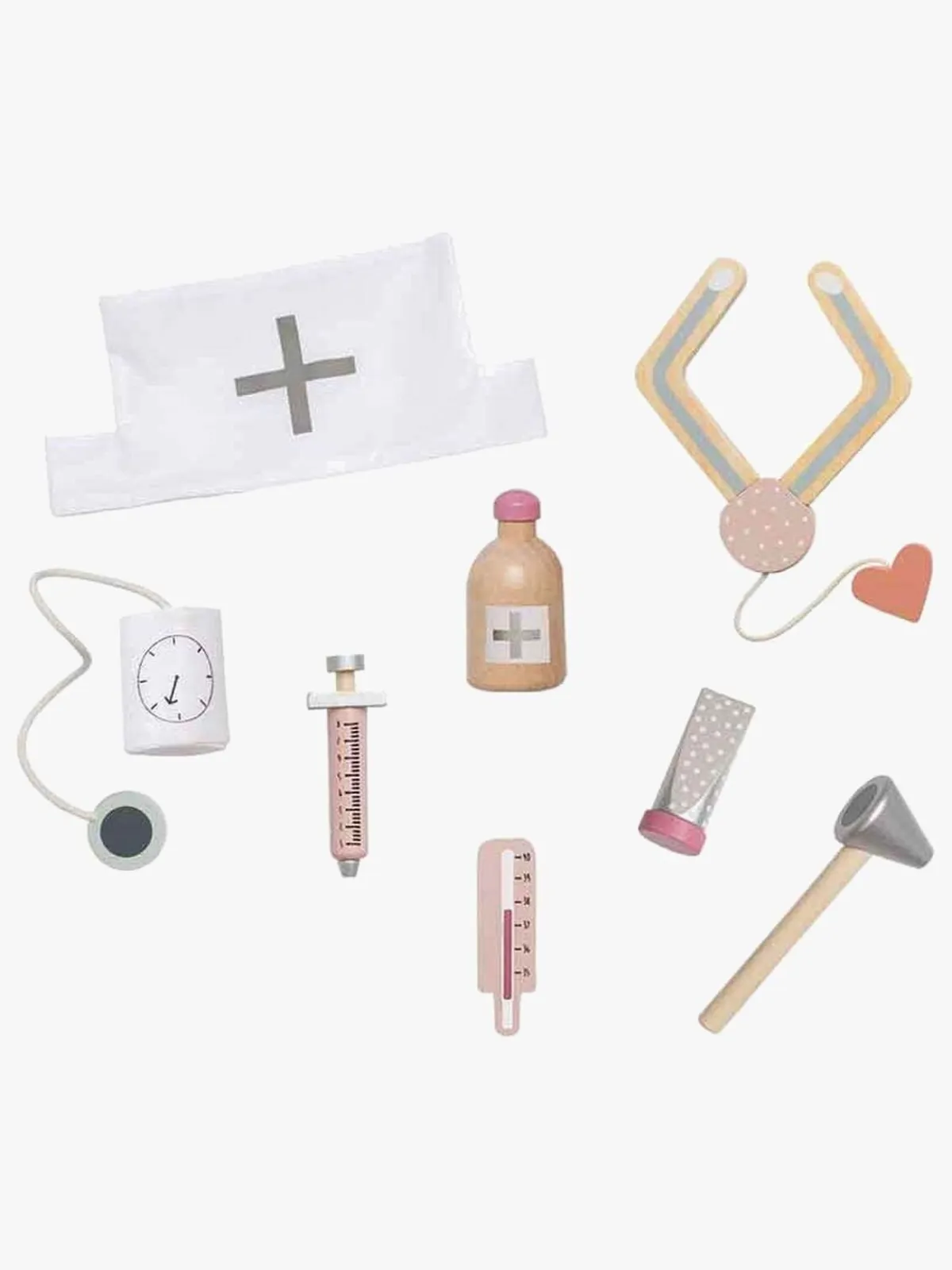 – Indeholder: 1 doktortaske, 1 stetoskop, 1 kanyle, 1 termometer, 1 dåse med salve, 1 blodtryksmåler, 1 doktorhat, 1 medicinflaske, 1 otoskop.