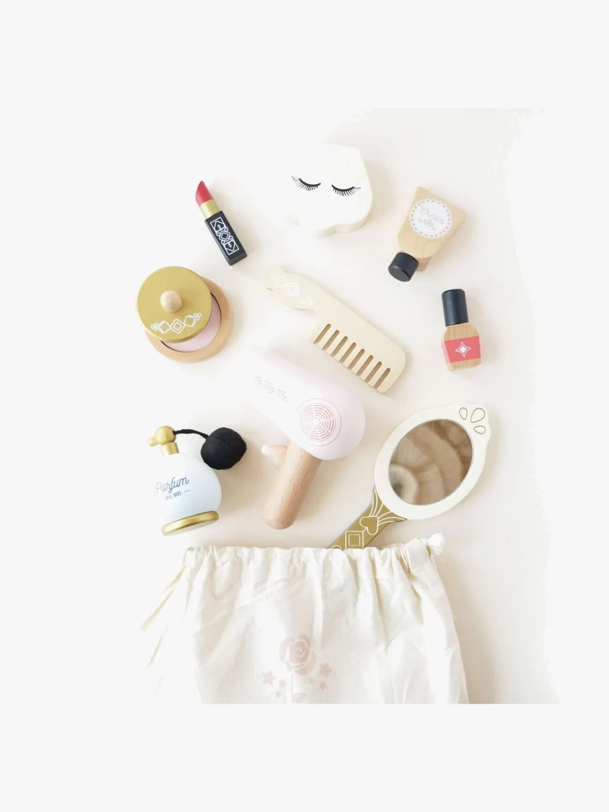 – Indeholder: 1 parfumeflaske, 1 spejl, 1 hårtørrer, 1 kam, 1 makeup, 1 lotionflaske, 1 neglelak, 1 læbestift, 1 puderkvast.