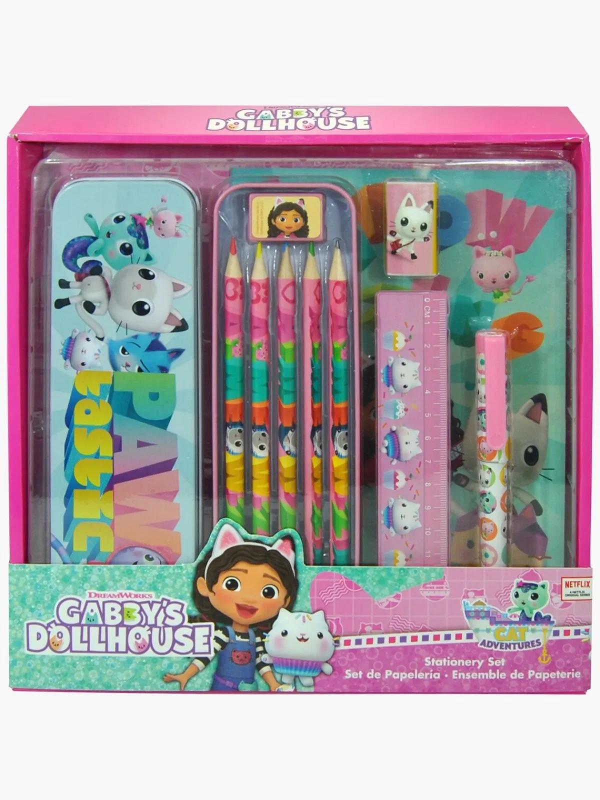 – Indeholder: 1 notesblok, 1 blyant, 5 farveblyanter, 1 lineal, 1 blyantspidser, 1 viskelæder, 1 blikæske.