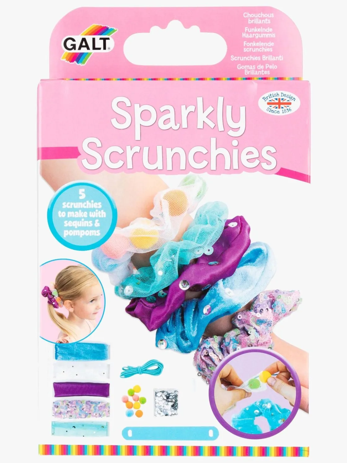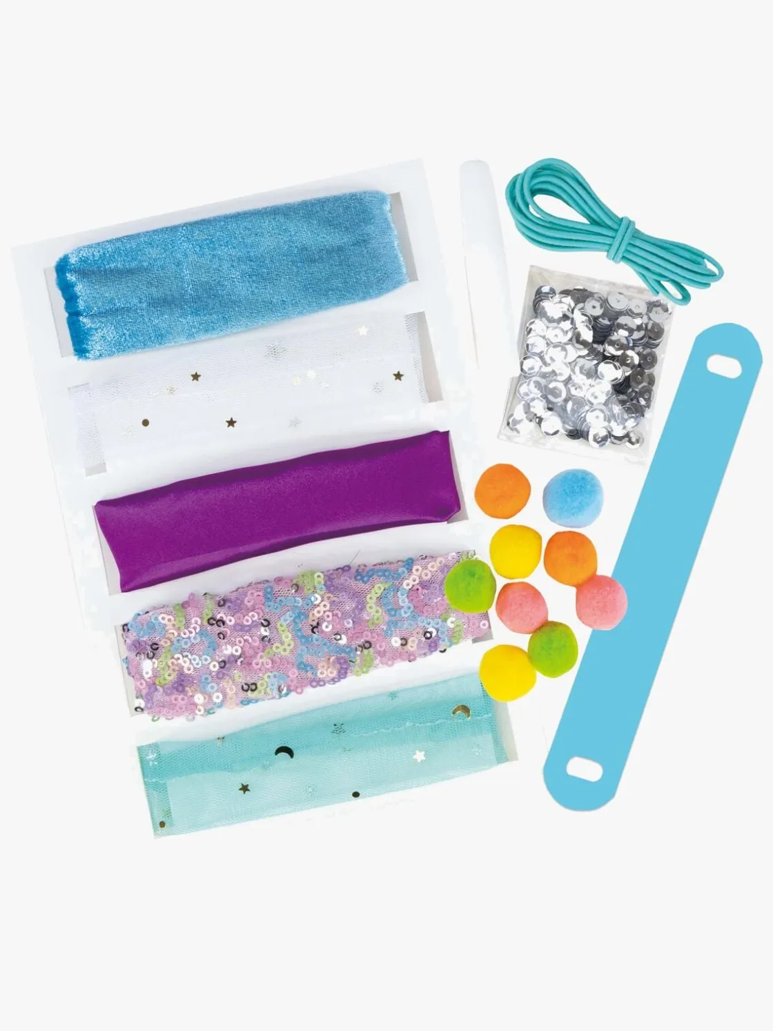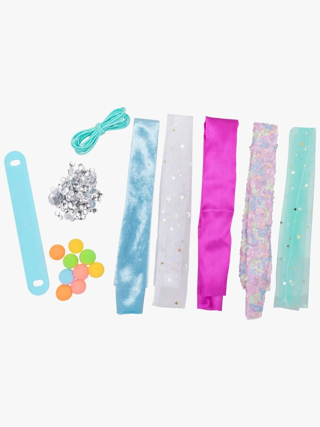 – Indeholder: scrunchie-værktøj, 5 stofruller, bolde, sølvpailletter, lim, 1,5 m elastisksnor og vejledning.
