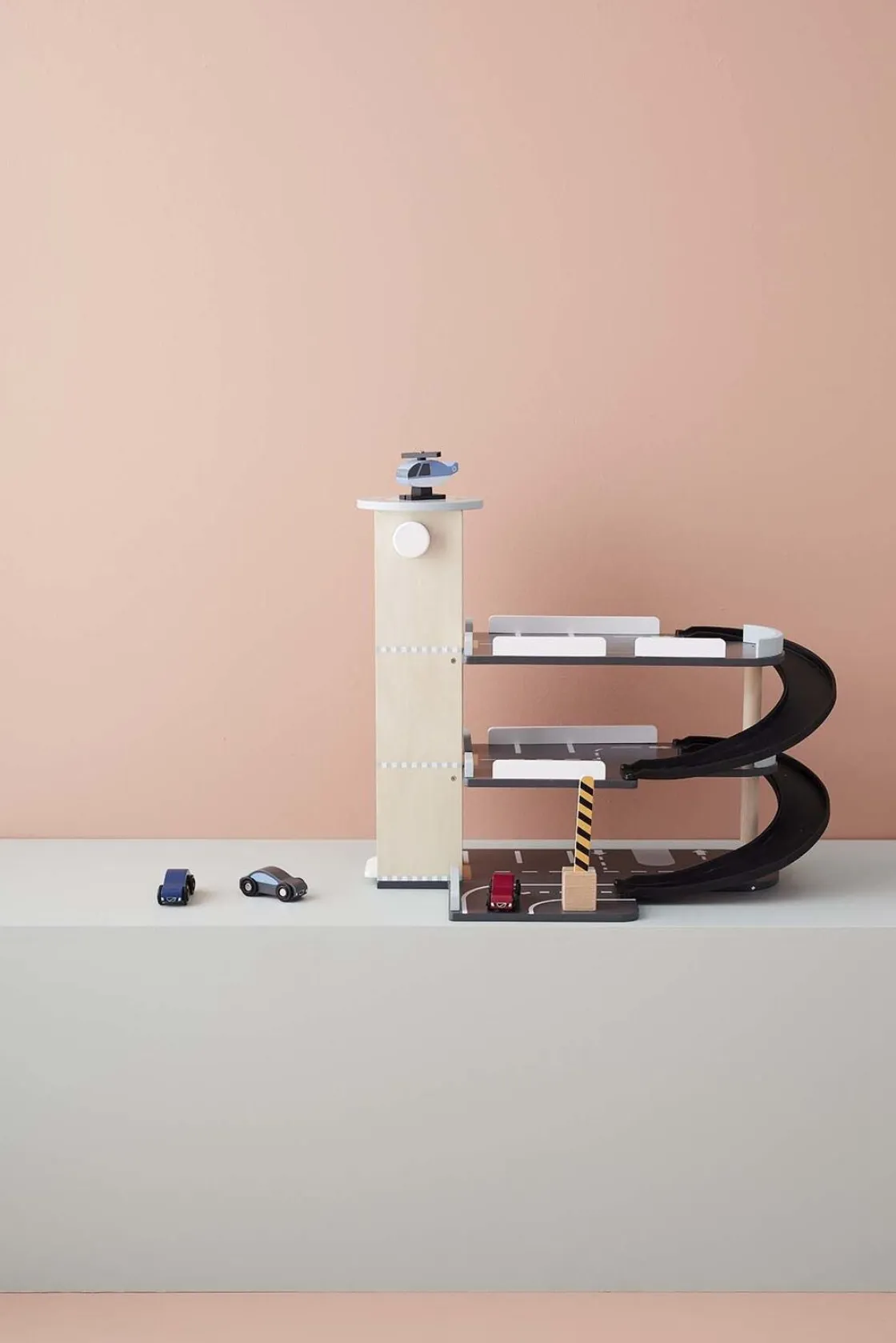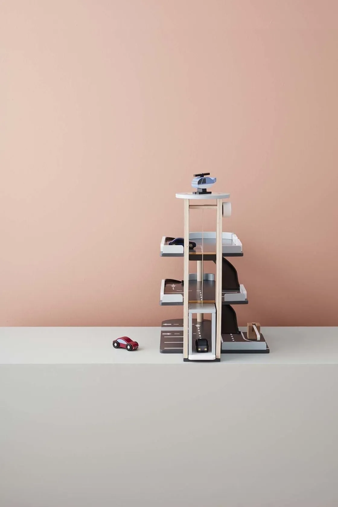Garagen har tre etager og en helipad på toppen. Ramper og parkeringsbåse er markerede og der er både en bom, der kan vippes og en elevator der kan flyttes op og ned. Der medfølger tre biler og en helikopter.