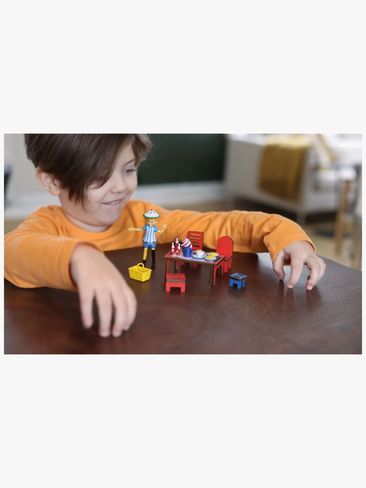 – Indeholder: 2 kager, 4 tallerkener, 3 kopper, 1 kaffekande, 3 saftflasker, 3 pandekager, 1 kurv og 1 fiskestang.