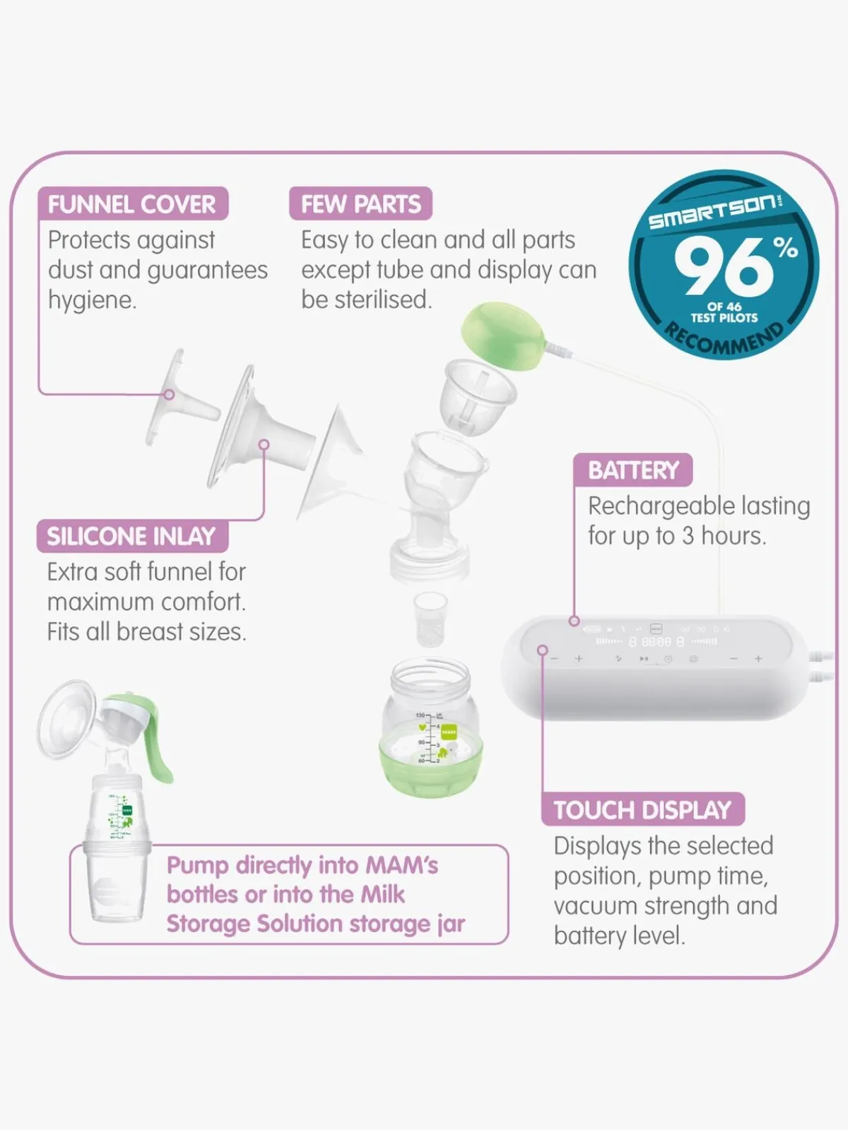 Hvis du gerne vil bruge den manuelle brystpumpe, er det let at skifte. Brystpumpen er kompatibel med MAM-sutteflasker og to Easy Start-sutteflasker, og der indgår to opbevaringsbøtter fra MAM. Du kan pumpe direkte i sutteflaskerne eller i bøtterne, så du kan opbevare mælken i køleskabet eller fryseren. Tidsbesparende!