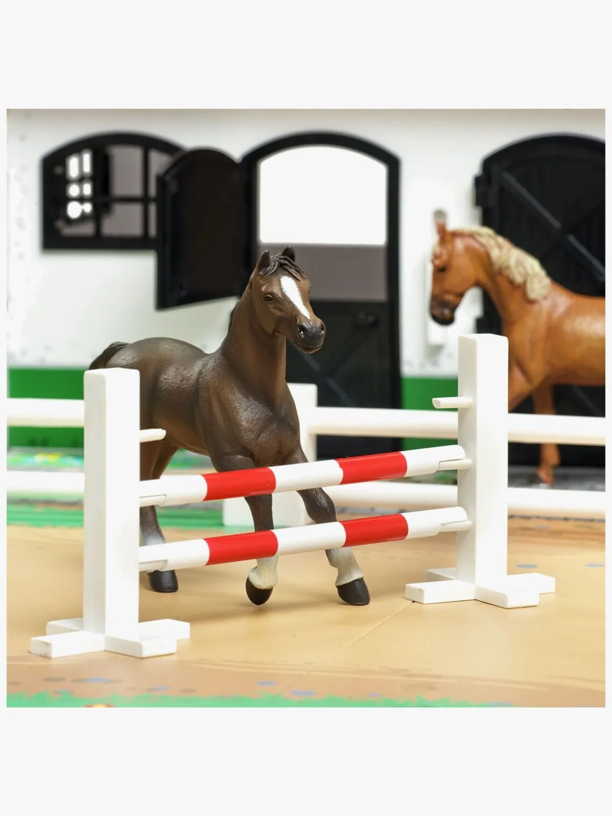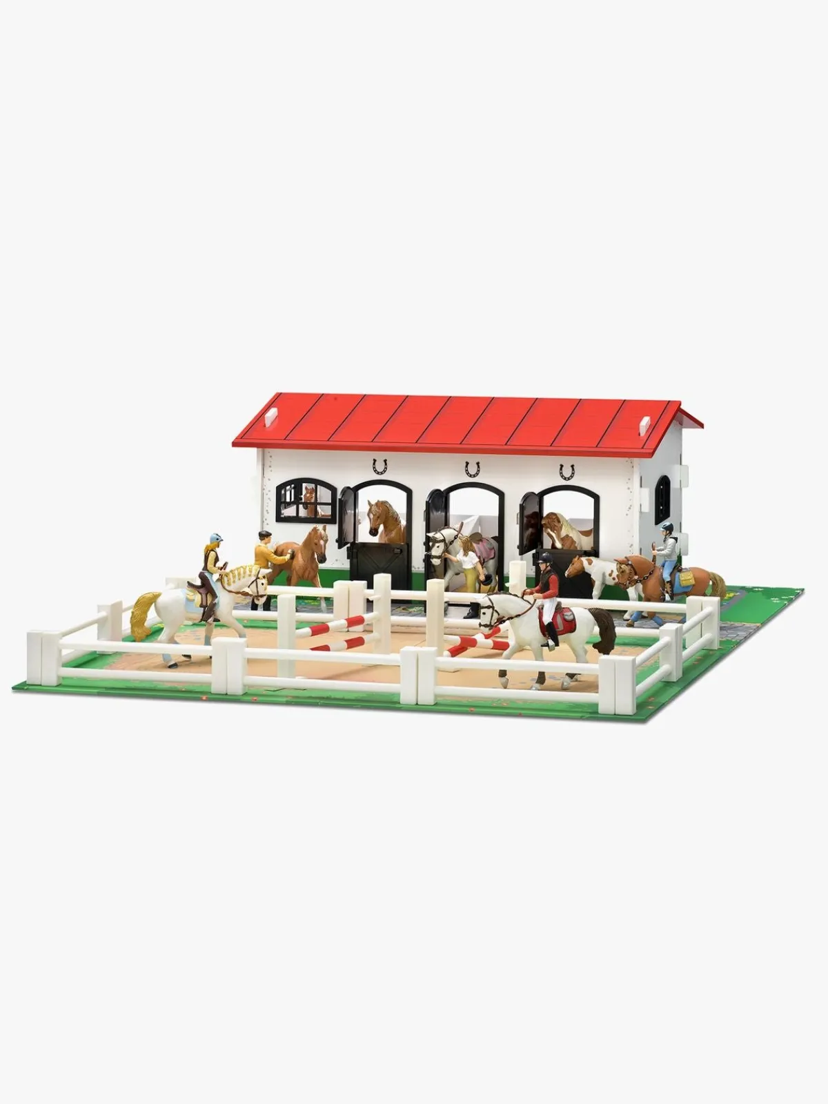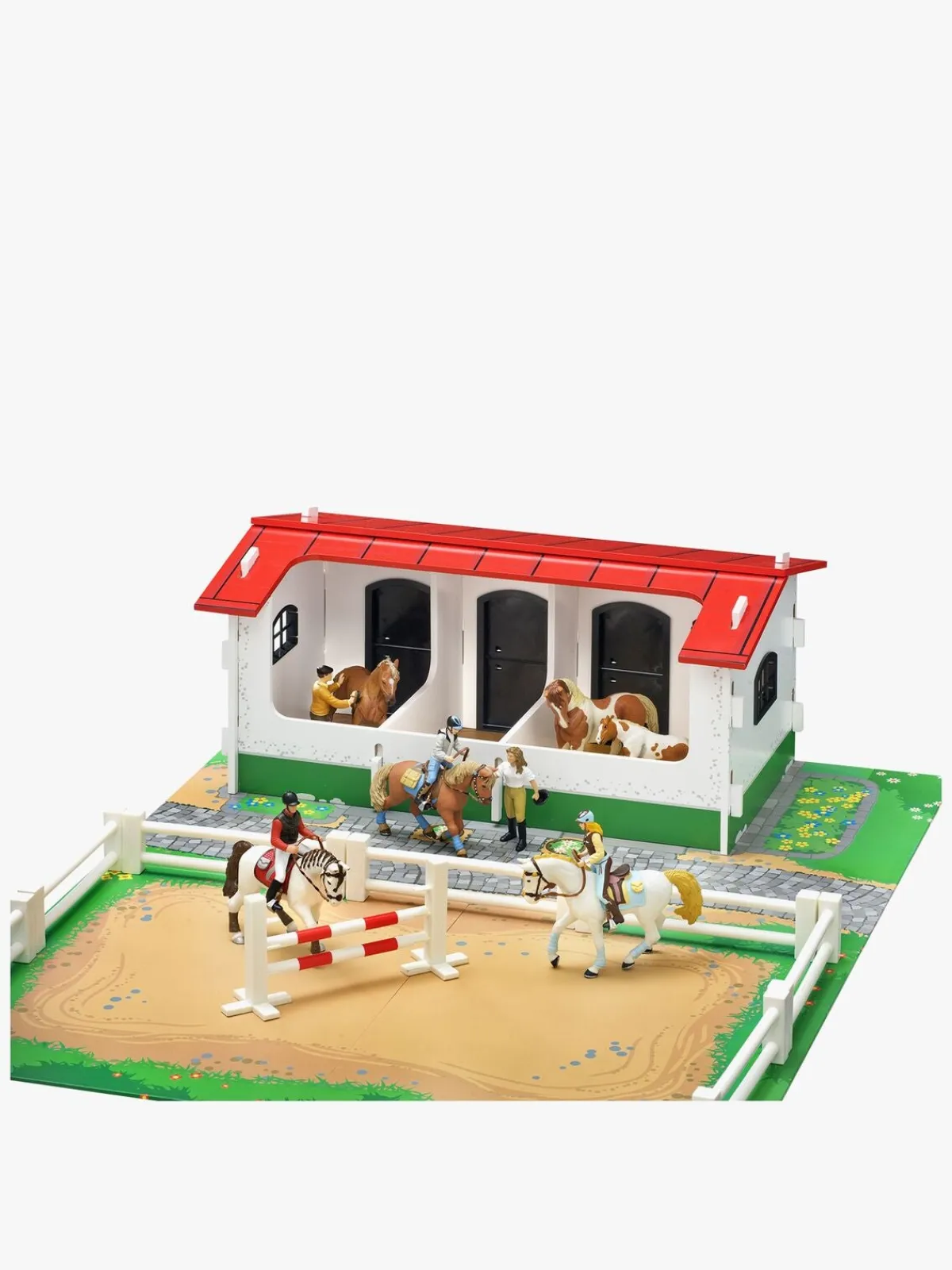 Inde i stalden er der tre båse, som alle kan åbnes og lukkes. Pakken indeholder også to forhindringer til hestefolden og ti stk. hegn.