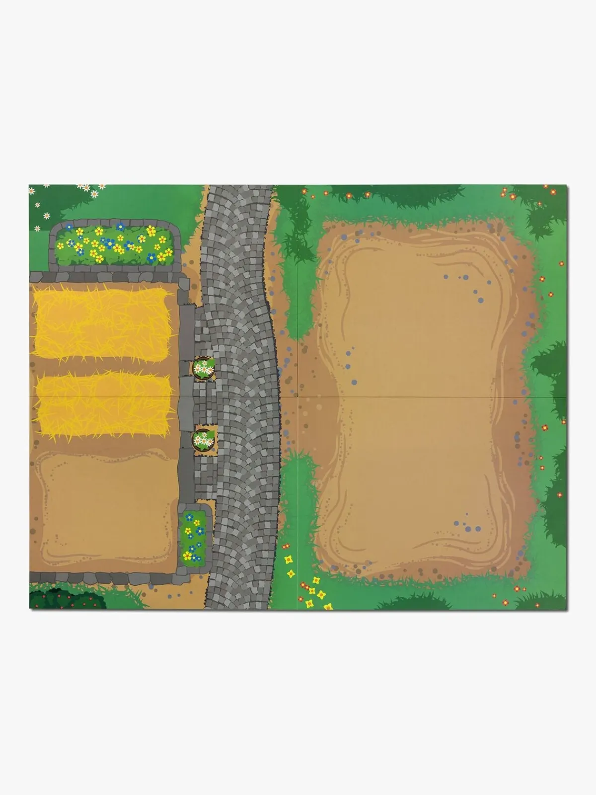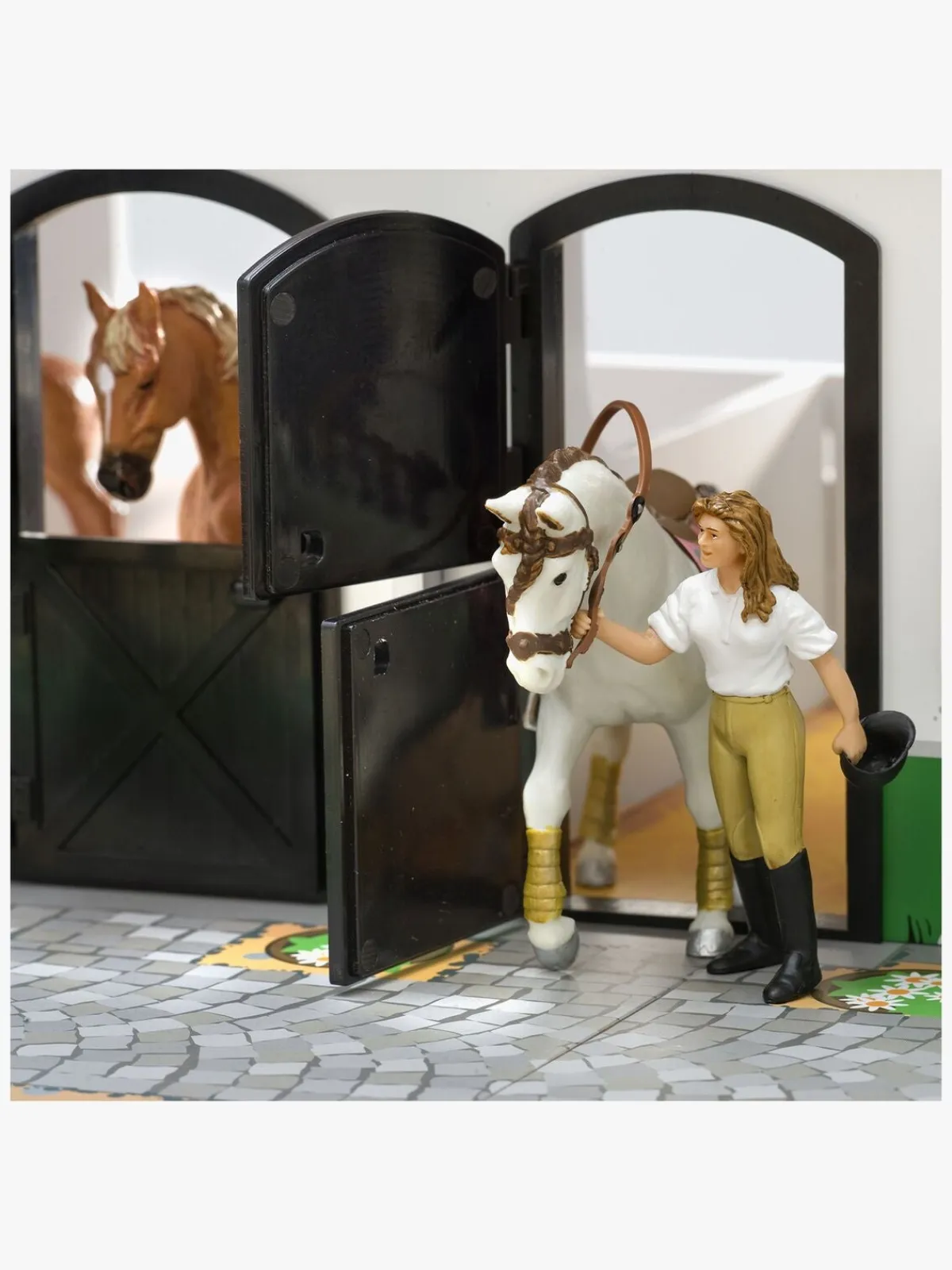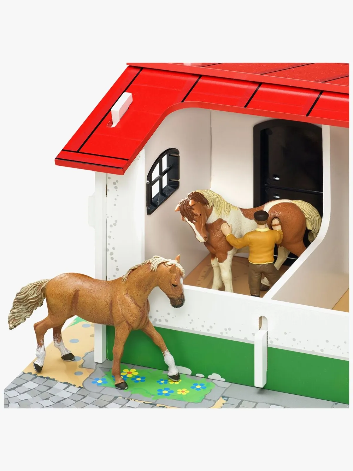 Inde i stalden er der tre båse, som alle kan åbnes og lukkes. Pakken indeholder også to forhindringer til hestefolden og ti stk. hegn.