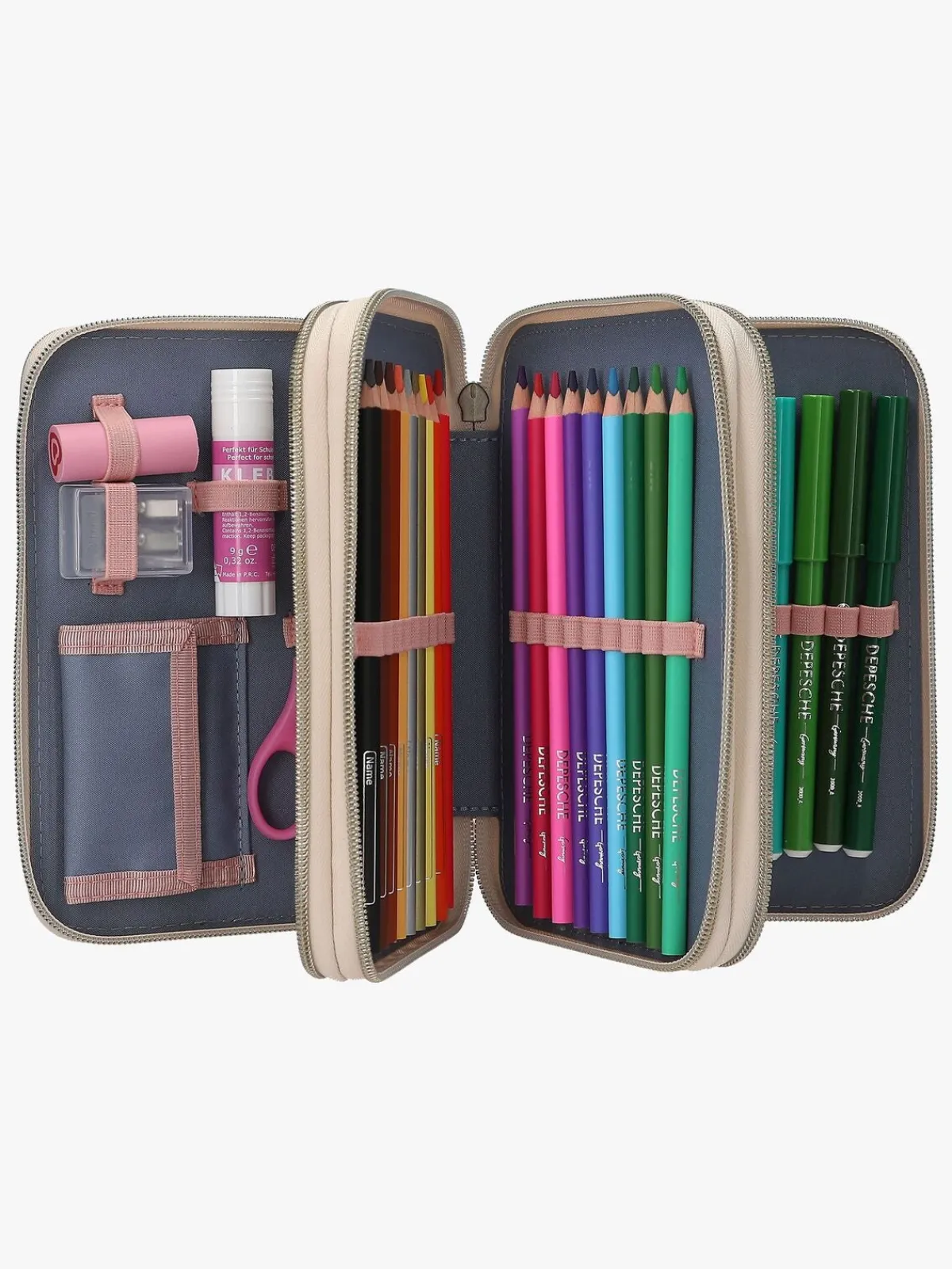 – Indeholder: 1 penalhus, 18 farveblyanter, 18 tusser, 2 blyanter, 1 saks, 1 limstift, 1 blyantspidser, 1 lineal, 1 viskelæder.