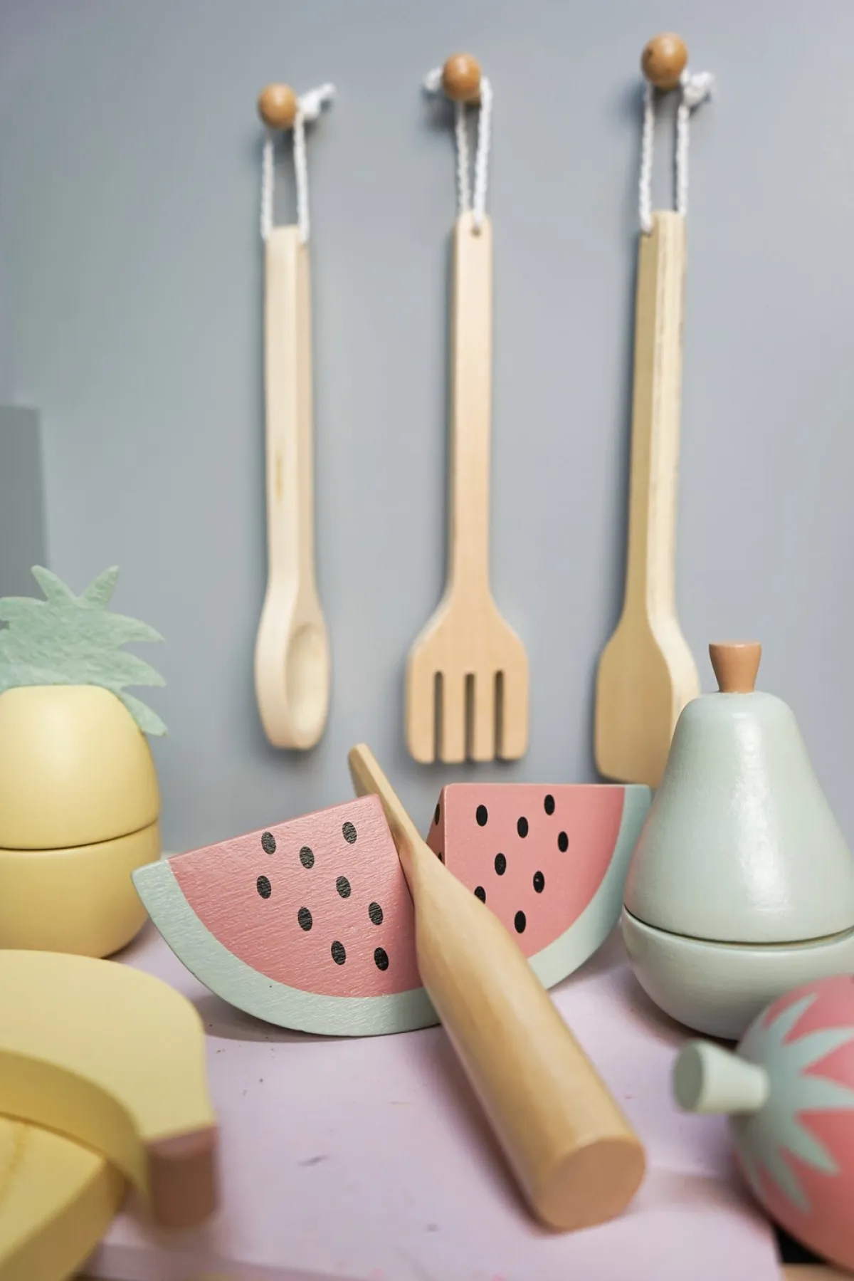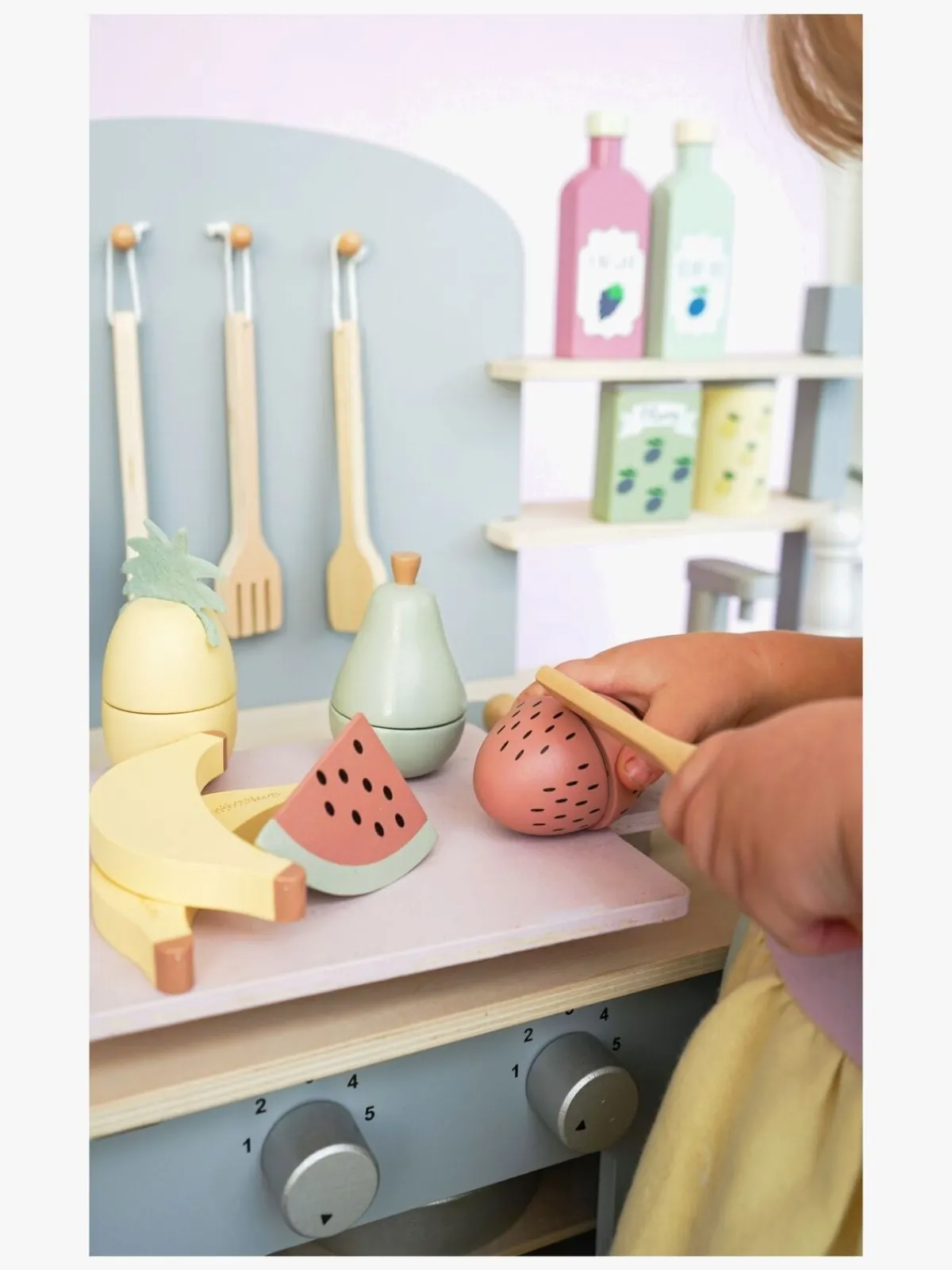 – Indeholder: 1 boks, 5 frugter, 1 legetøjskniv.