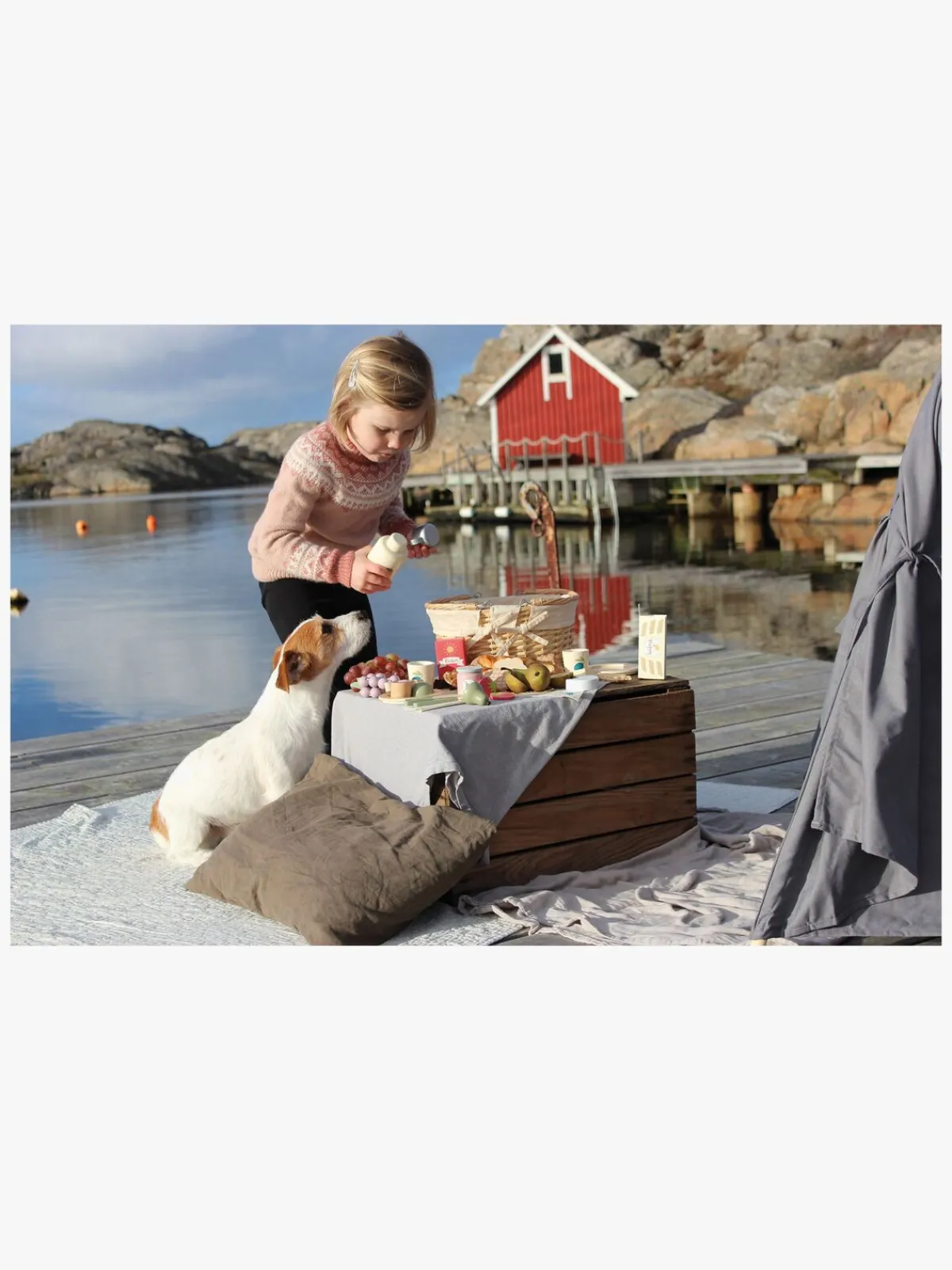 – Indeholder: 1 picnickurv, 2 duge, 2 tallerkener, 2 knive, 2 gafler, 2 servietter, 2 kopper, 1 termokande, 2 vafler, 2 småkager, 2 croissanter, 1 pakke med småkager, 1 rosinpakke, 1 marmeladeglas, 1 vindrueklase, 1 brieost, 1 pølse, 1 pære, 2 jordbær.