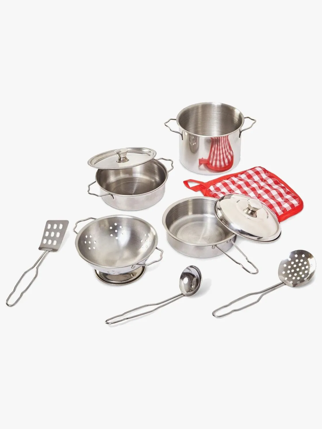 – Indeholder: 2 gryder med et låg, 1 pande med et låg, 1 si, 3 køkkenredskaber, 1 grydelap.