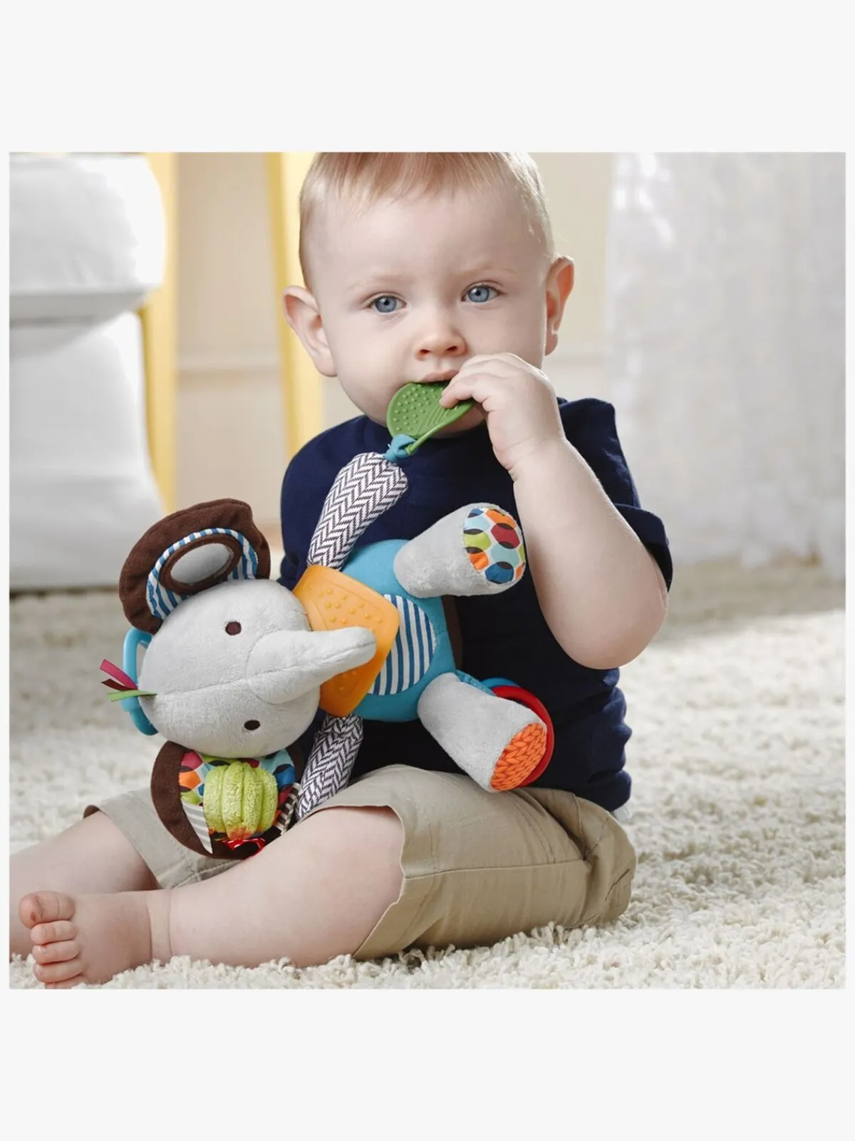 Dette legetøj kan med fordel tages med på tur i barnevognen, da plastikringen gør den nem at hænge op på diverse bøjler og snører.