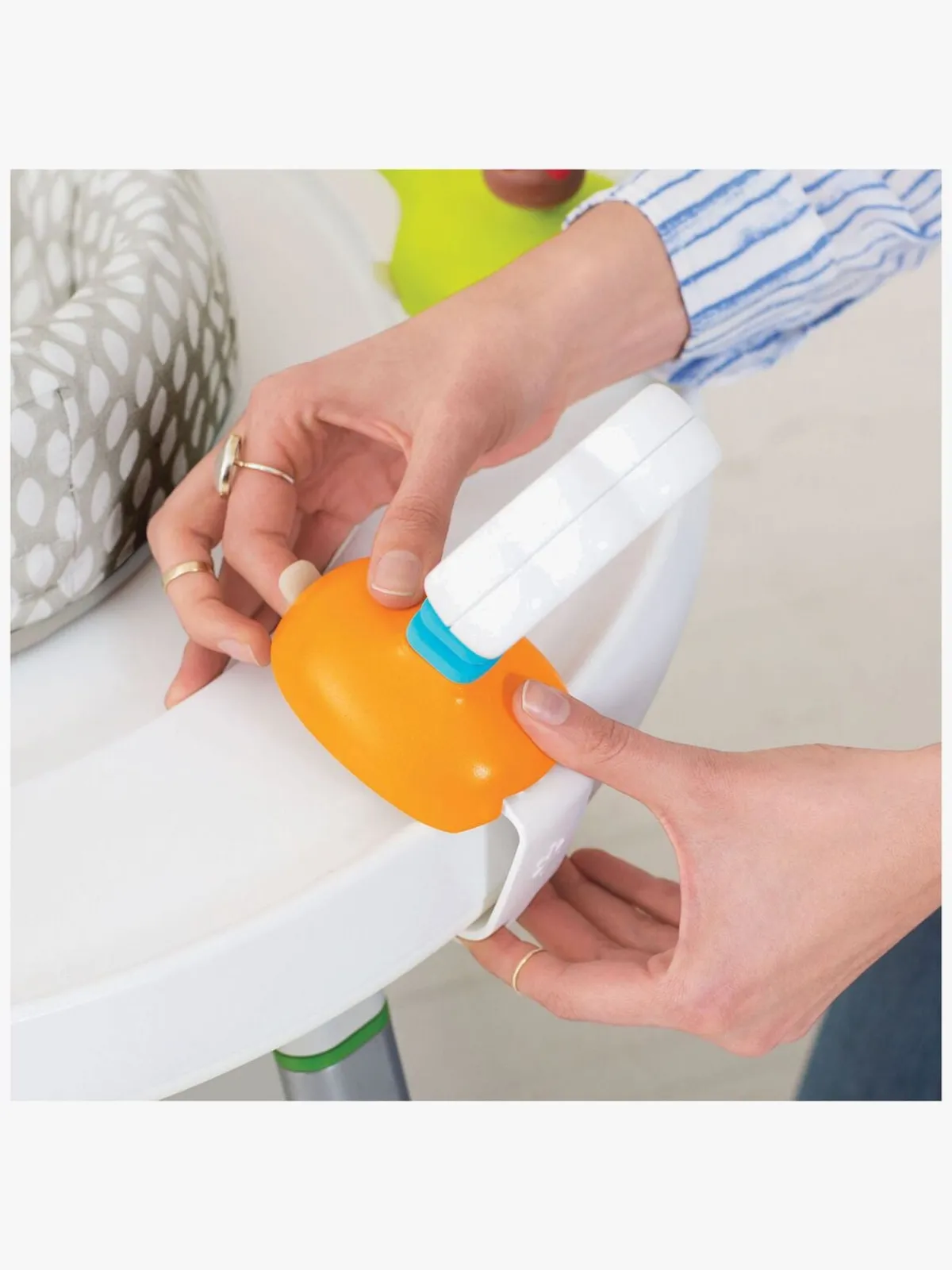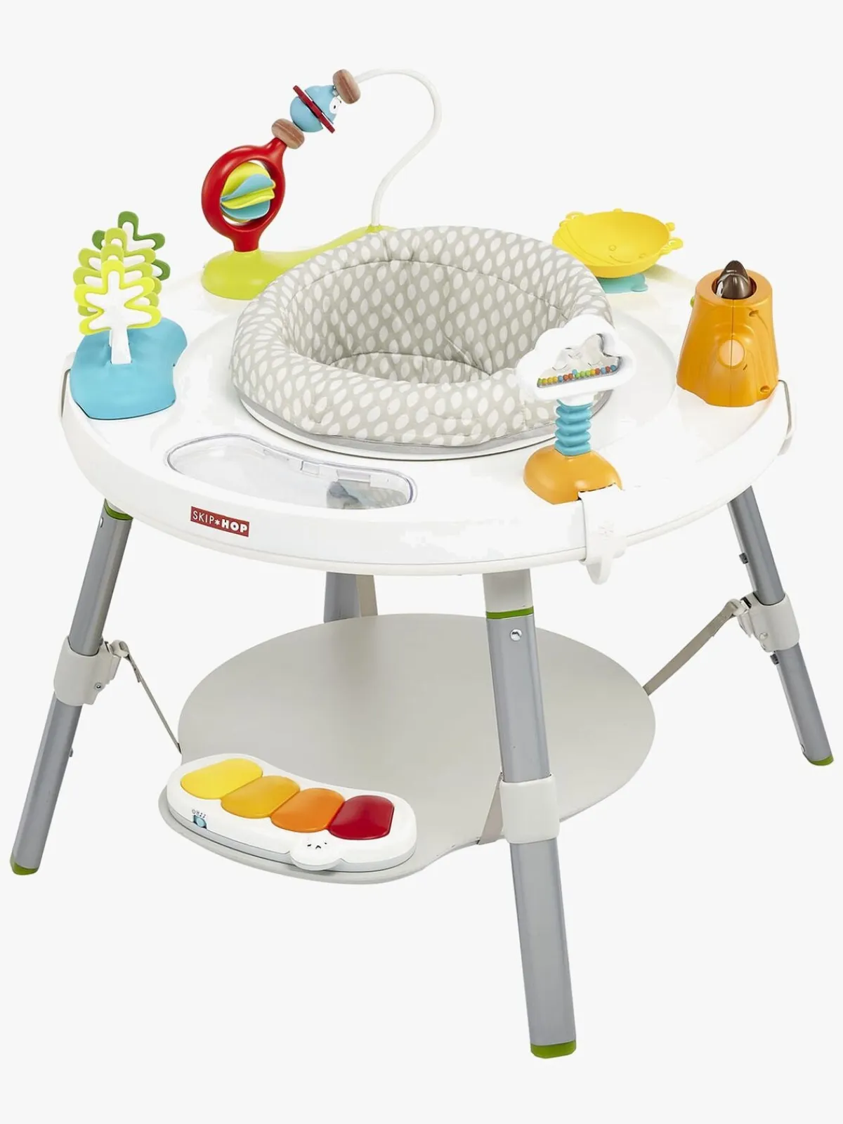 Sædet kan roteres 360 grader og det elastiske stof lader barnet støtte benene mod fodstøtten, der også kan justeres i højden. Legetøjet kan flyttes rundt på bordet efter smag og behag, og når barnet bliver større kan du tage alle legesager samt sæde væk, og lave aktivitetscenteret om til et almindeligt bord, hvor barnet kan sidde og lege. Foruden det sjove aktivitetslegetøj medfølger også en tallerken med sugekop på undersiden.