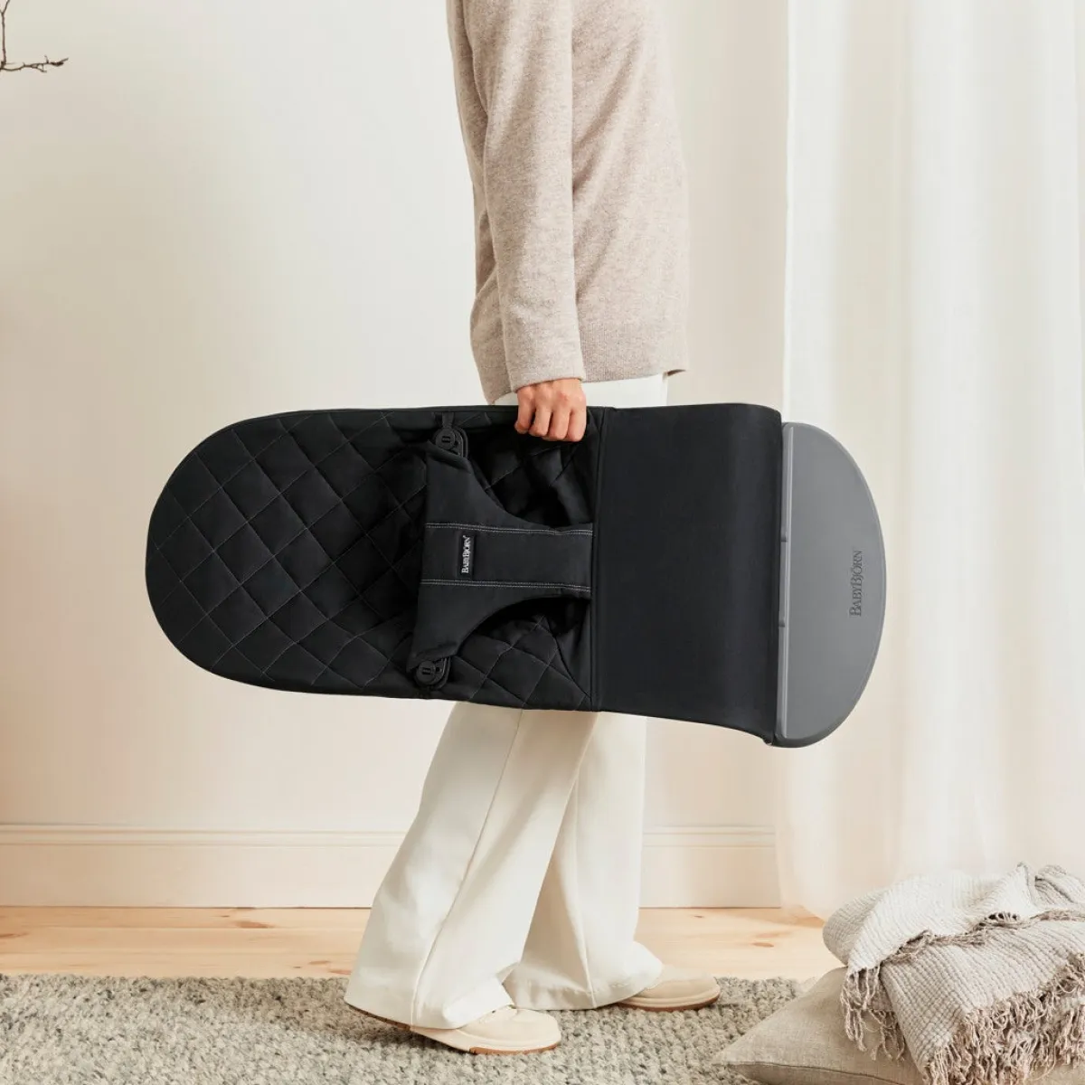 – Når barnet kan sidde uden støtte, kan skråstolen laves om til en stol.