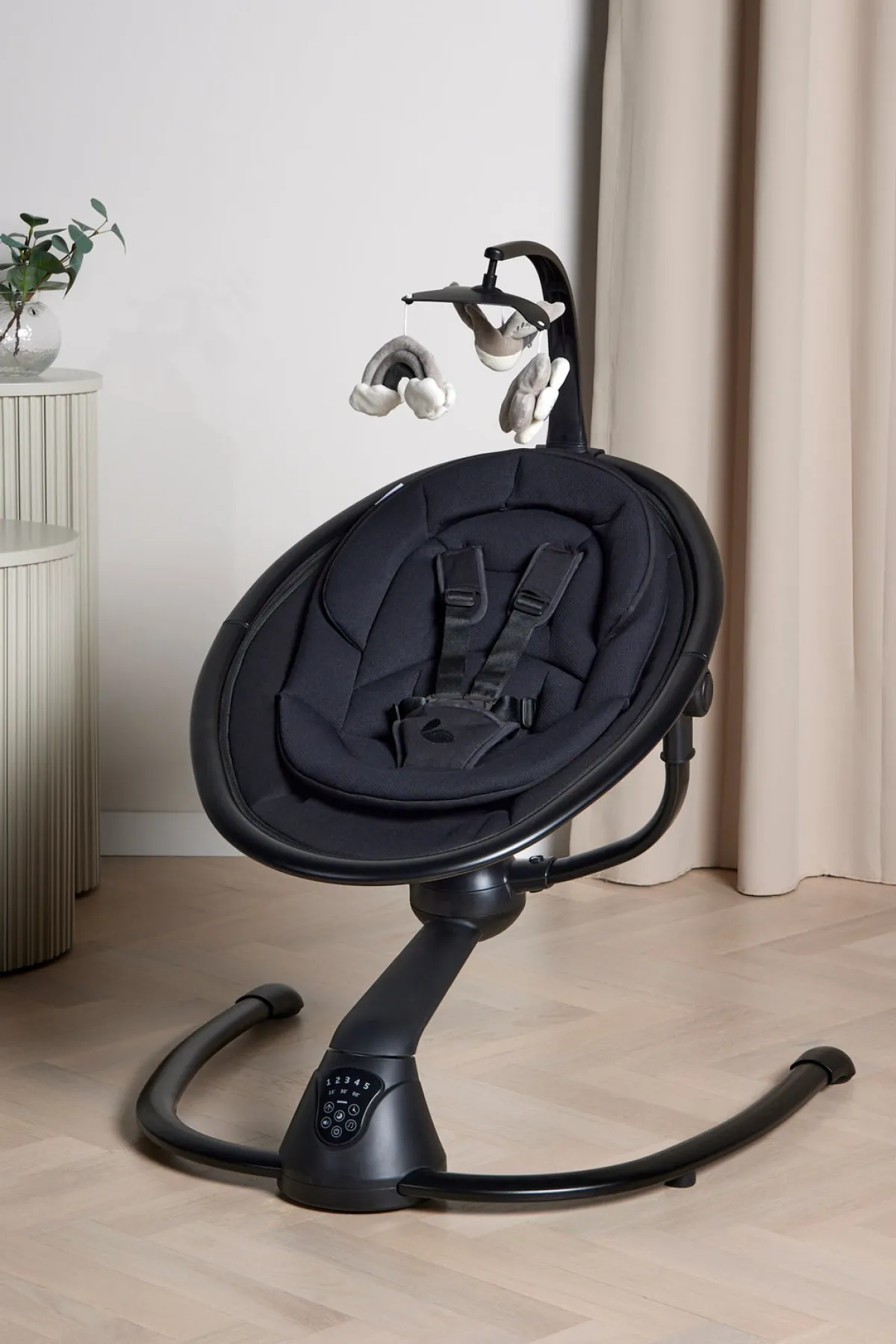 – Fjernkontrol medfølger til justering af gynge- og musikfunktion.
