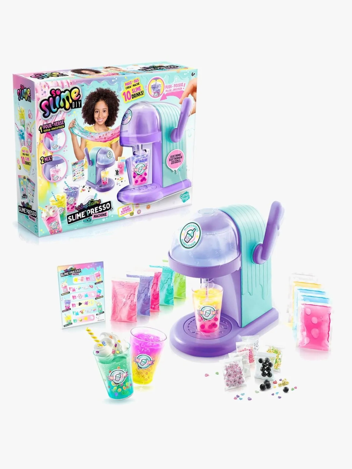 – Indeholder: 1 elektrisk blender, 2 piberensere, 1 opskriftskort, 10 slimepulvere, 5 slime, 3 kopper, 8 poser med pynt, 3 sugerør.