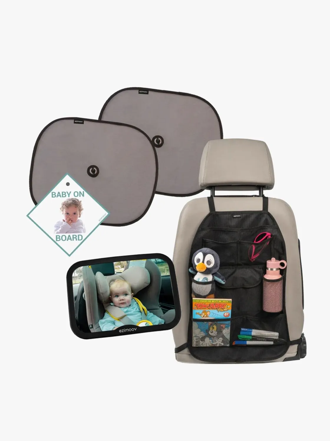 – Indeholder: 1 bilspejl, 1 sædebeskytter med opbevaring, 2 solskærme, 1 ”baby on board”-skilt.