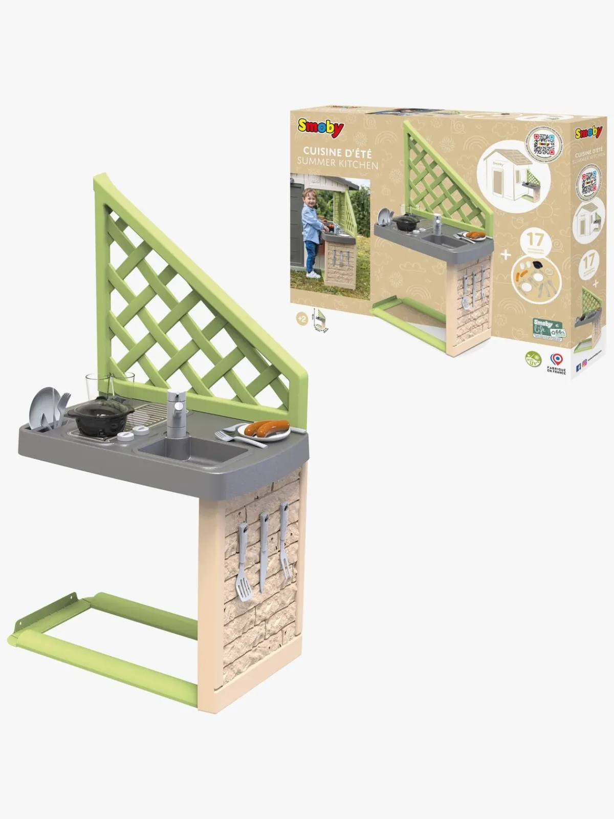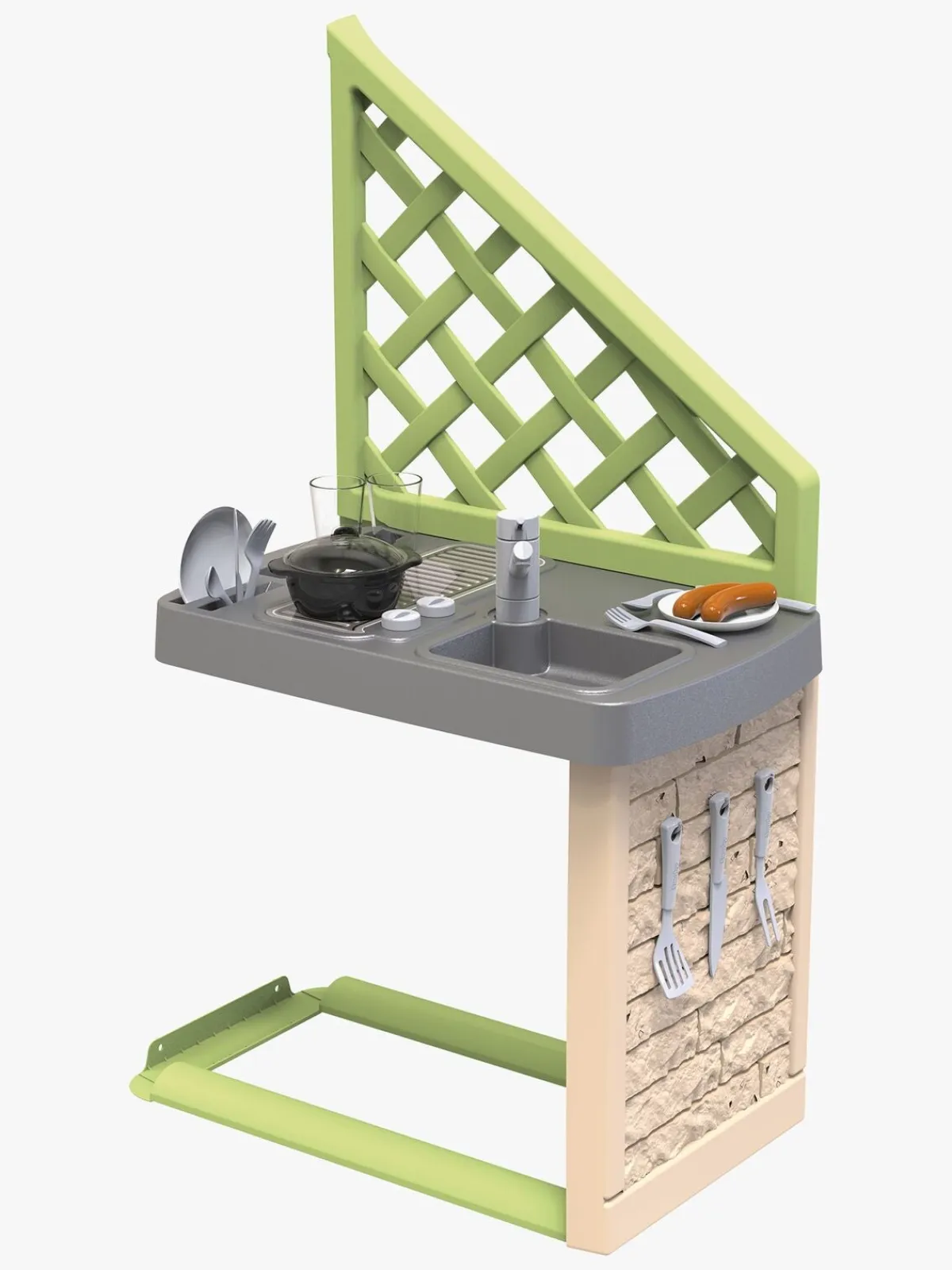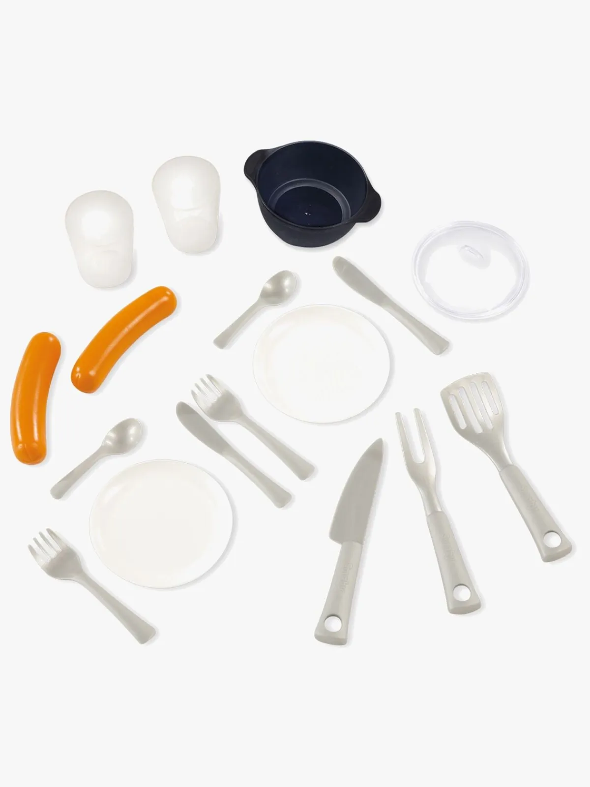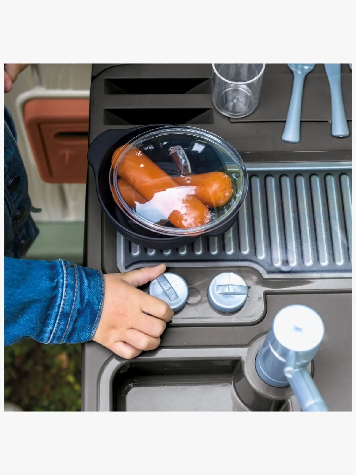 – Indeholder: 1 køkken, 2 stk. bestik, 2 glas, 2 pølser, 1 gryde med et låg, 1 legetøjskniv, 1 paletkniv, 1 grillgaffel.