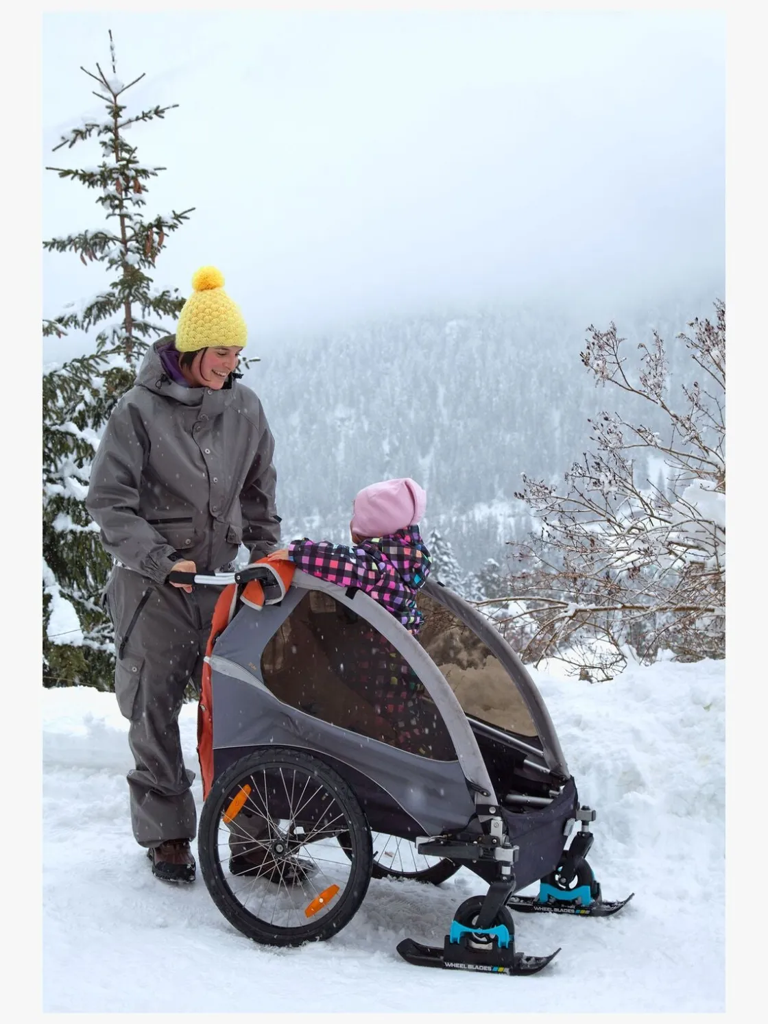 Takket være det patenterede hurtigbeslag er det let og hurtigt at skifte fra hjul til ski. Wheelblades brede overflade gør, at vægten fordeler sig optimalt på underlaget og forhindrer forhjulene i at synke ned i sneen.