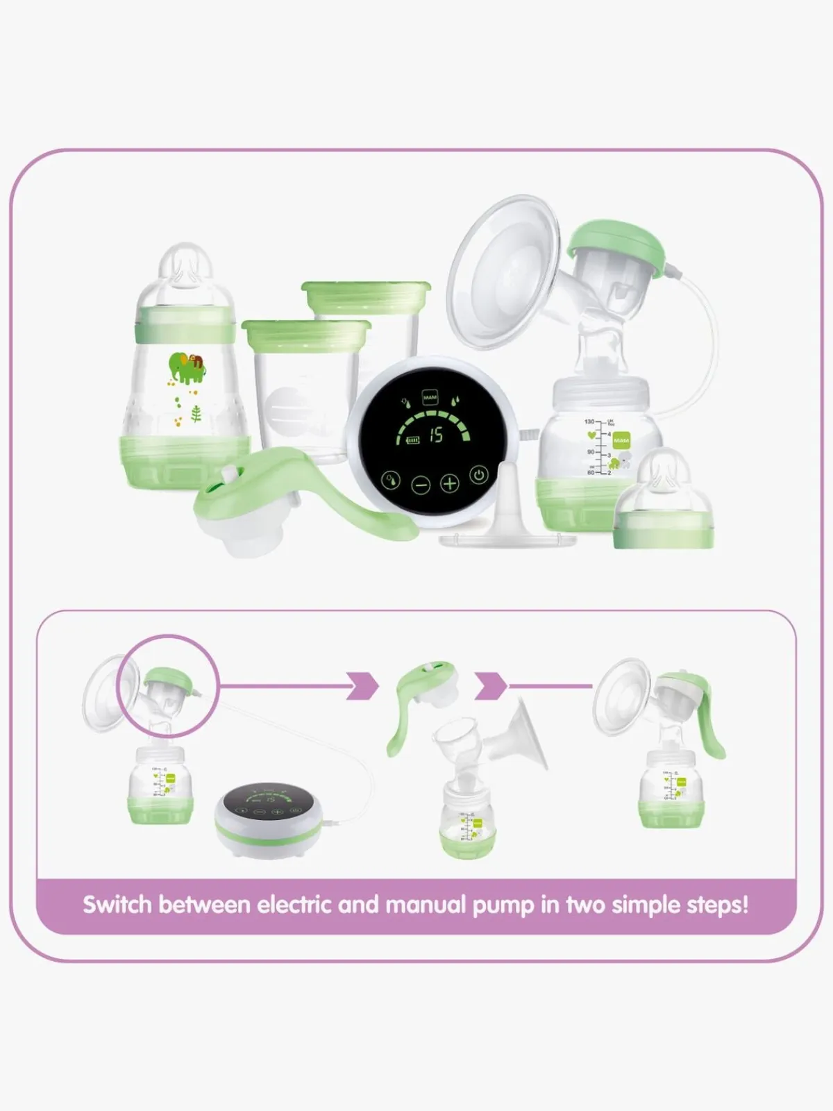 Vil du bruge den manuelle pumpe, er det let at skifte. Pumpen passer til sutteflaskerne fra MAM. To Easy Start-sutteflasker og en opbevaringsbeholder fra MAM indgår i købet! Du kan pumpe direkte i sutteflasken eller beholderen og så opbevare mælken i køleskabet eller fryseren.