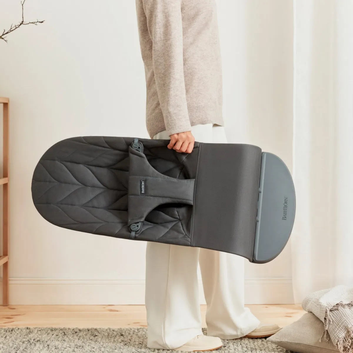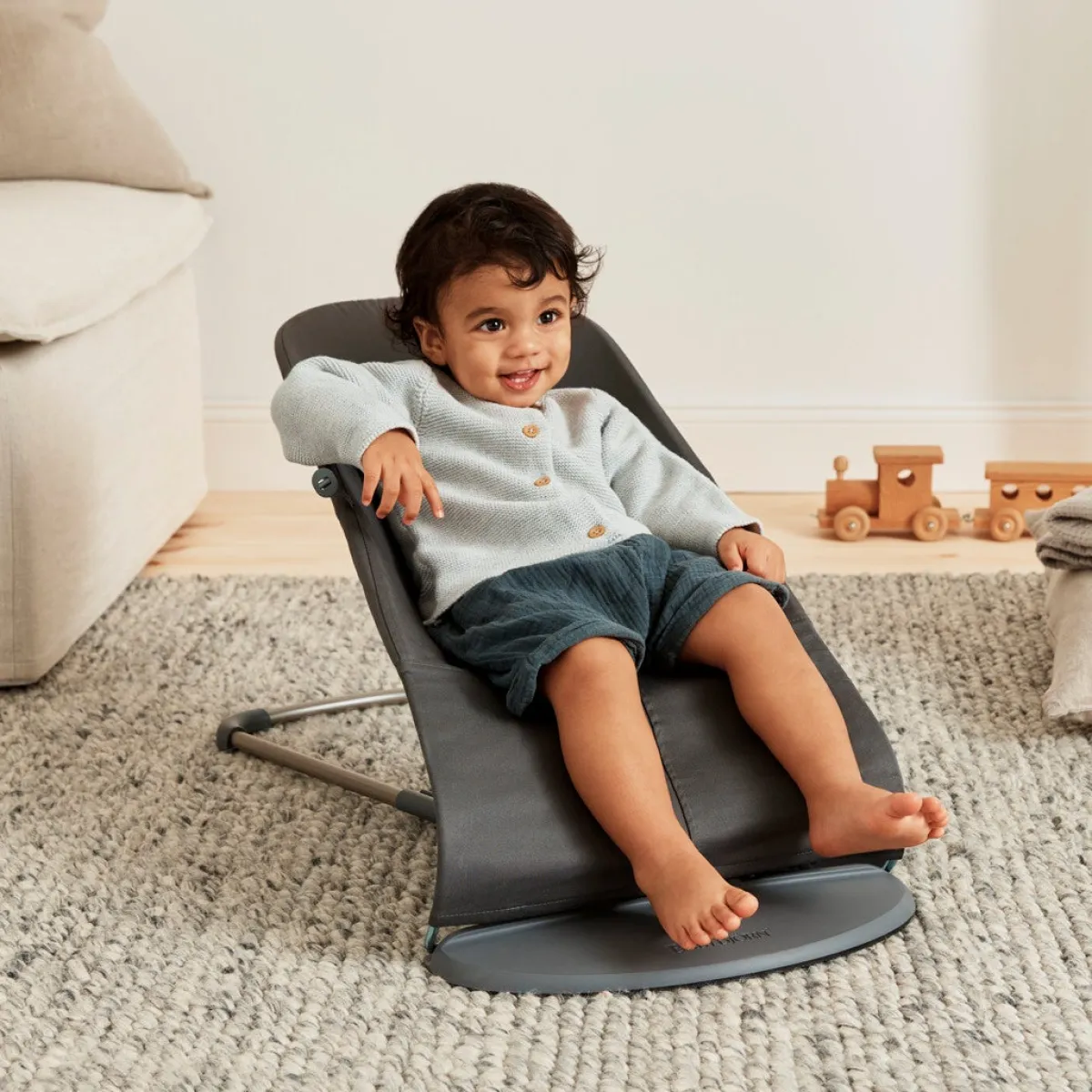 – Når barnet kan sidde uden støtte, kan skråstolen laves om til en stol.