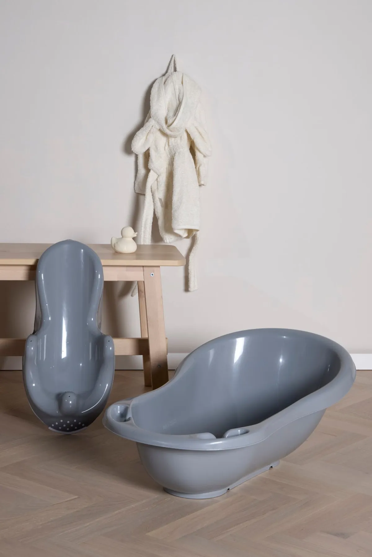 I denne pakke får du også skridsikker badestol fra Beemoo, der kan stå stabilt i badekarret. Bruger du badestolen, han du have begge hænder fri, så du kan lege med dit badende barn.