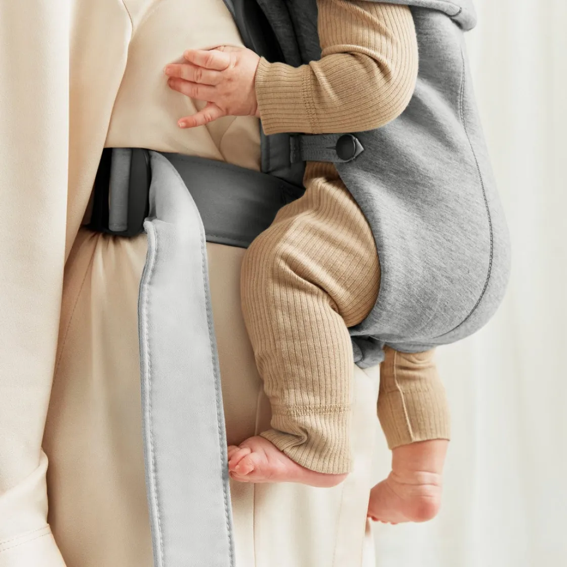 – Denne bæresele har ekstra bredde (10 cm på det bredeste sted) i forhold til Babybjörn Original. Det giver en bedre støtte til barnets ben og hofter i den indadvendte stilling.