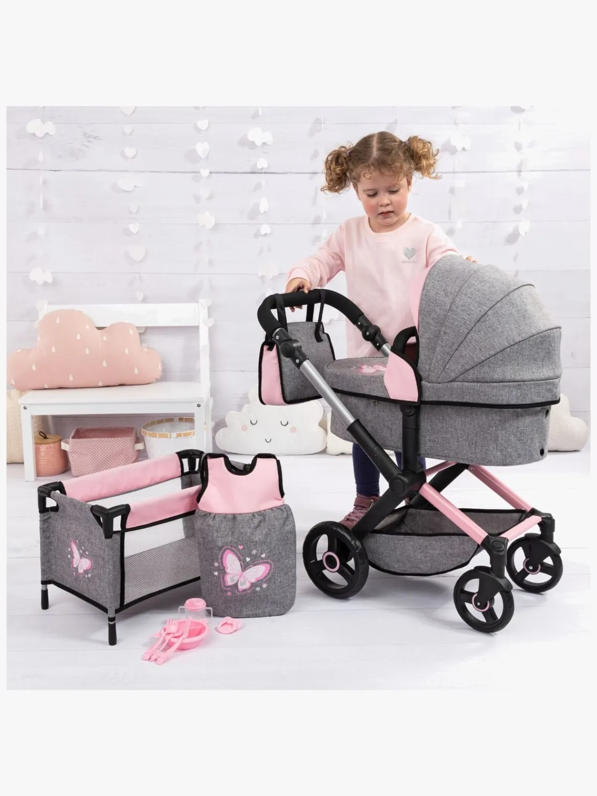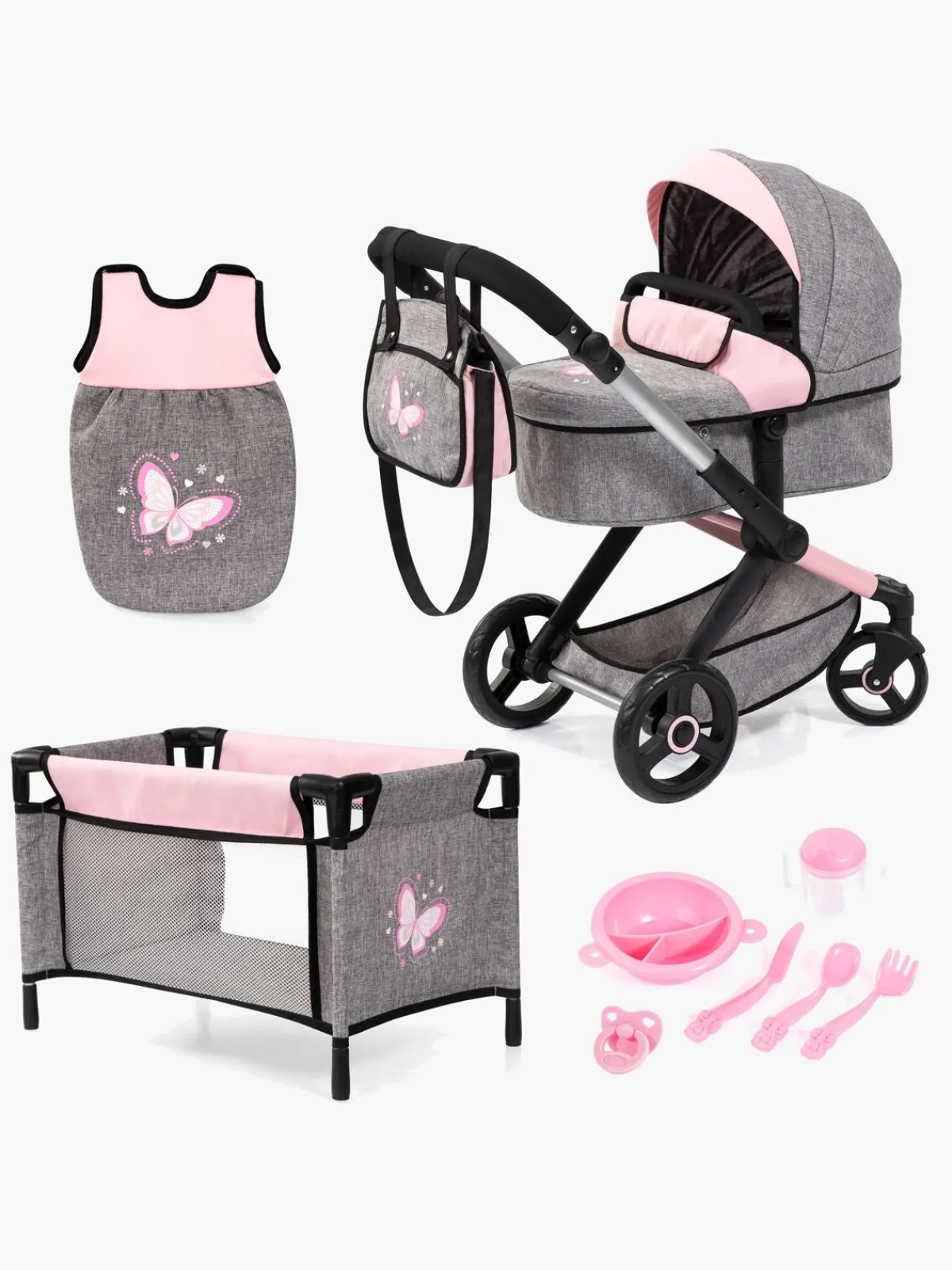 – Indeholder: 1 dukkevogn, 1 seng, 1 sovepose, 1 pusletaske, 1 tallerken, 3 bestik, 1 tudekop, 1 sut.