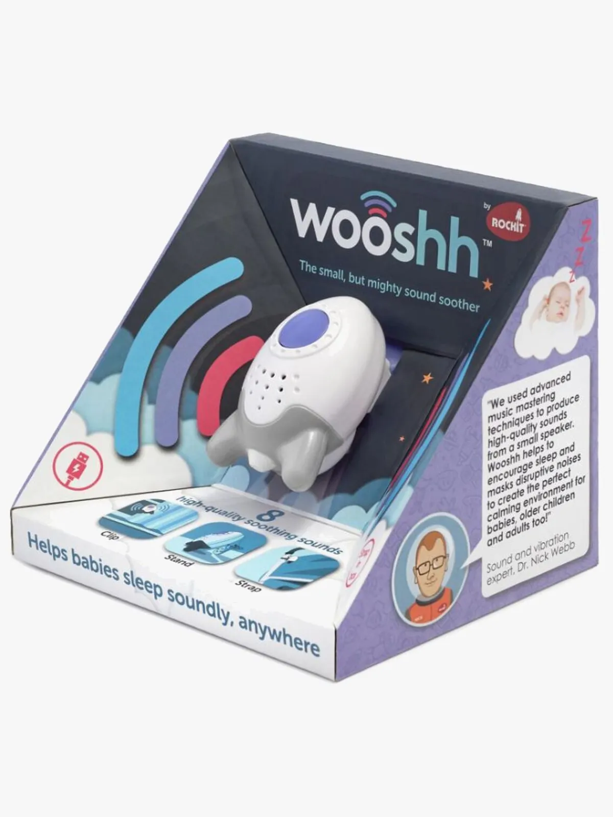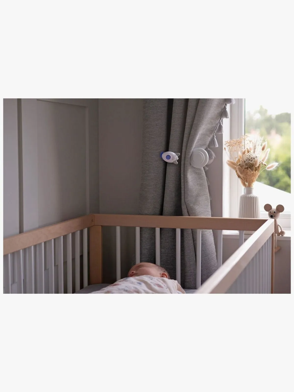 – Kan afspille beroligende vuggeviser, hvid støj eller naturlige lyde.