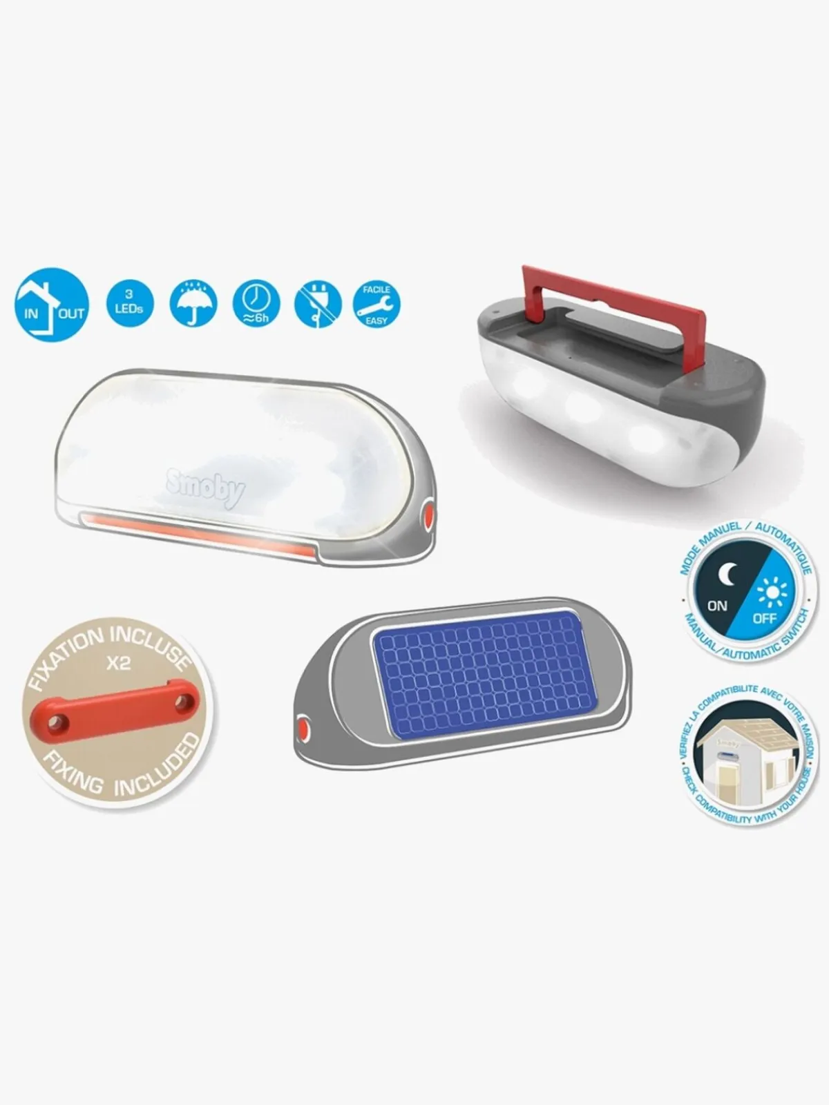 Lampen passer til de nye Smoby-legehuse (inklusive Neo Jura Lodge Playhouse, My Neo House, Chef House, Garden House, Neo Friends House og Neo Friends House + sommerkøkken). Kontroller kompatibiliteten.