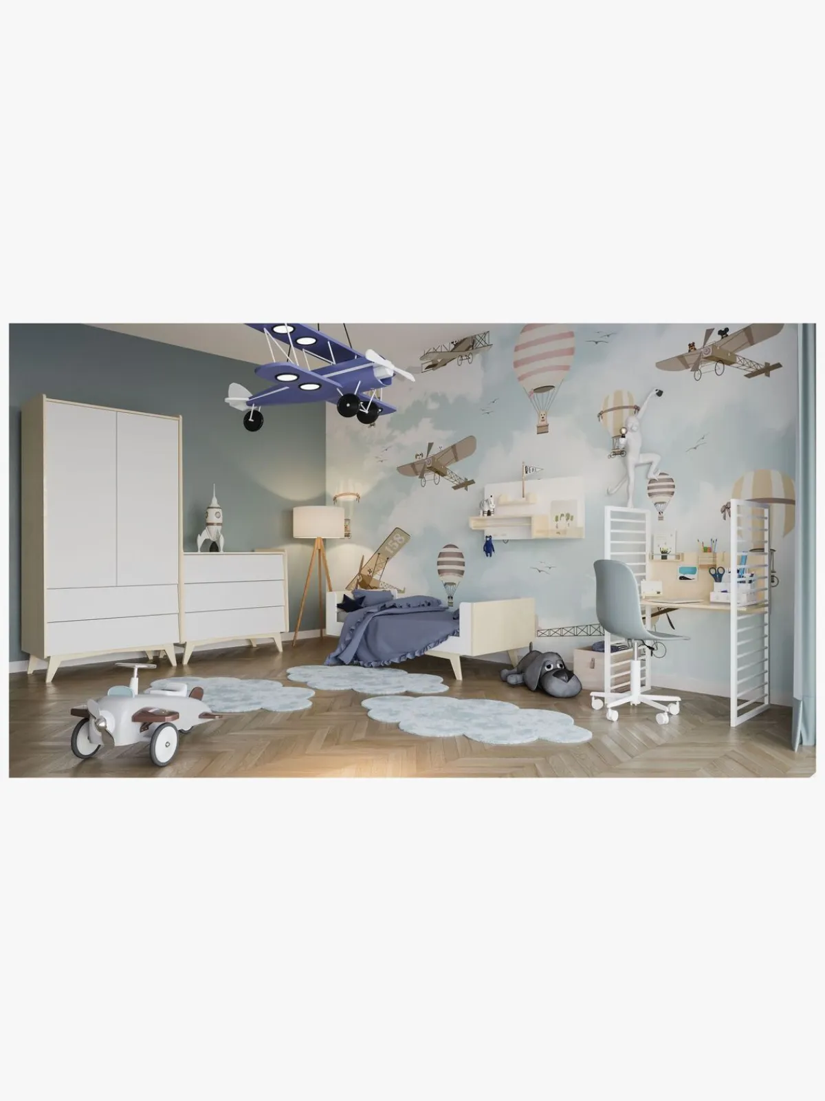 – Skrivebord. Tremmerne laves om til et skrivebord med justerbar højde, når barnet kan bruge sengen uden dem.