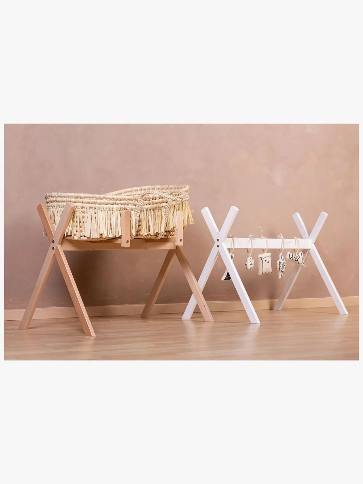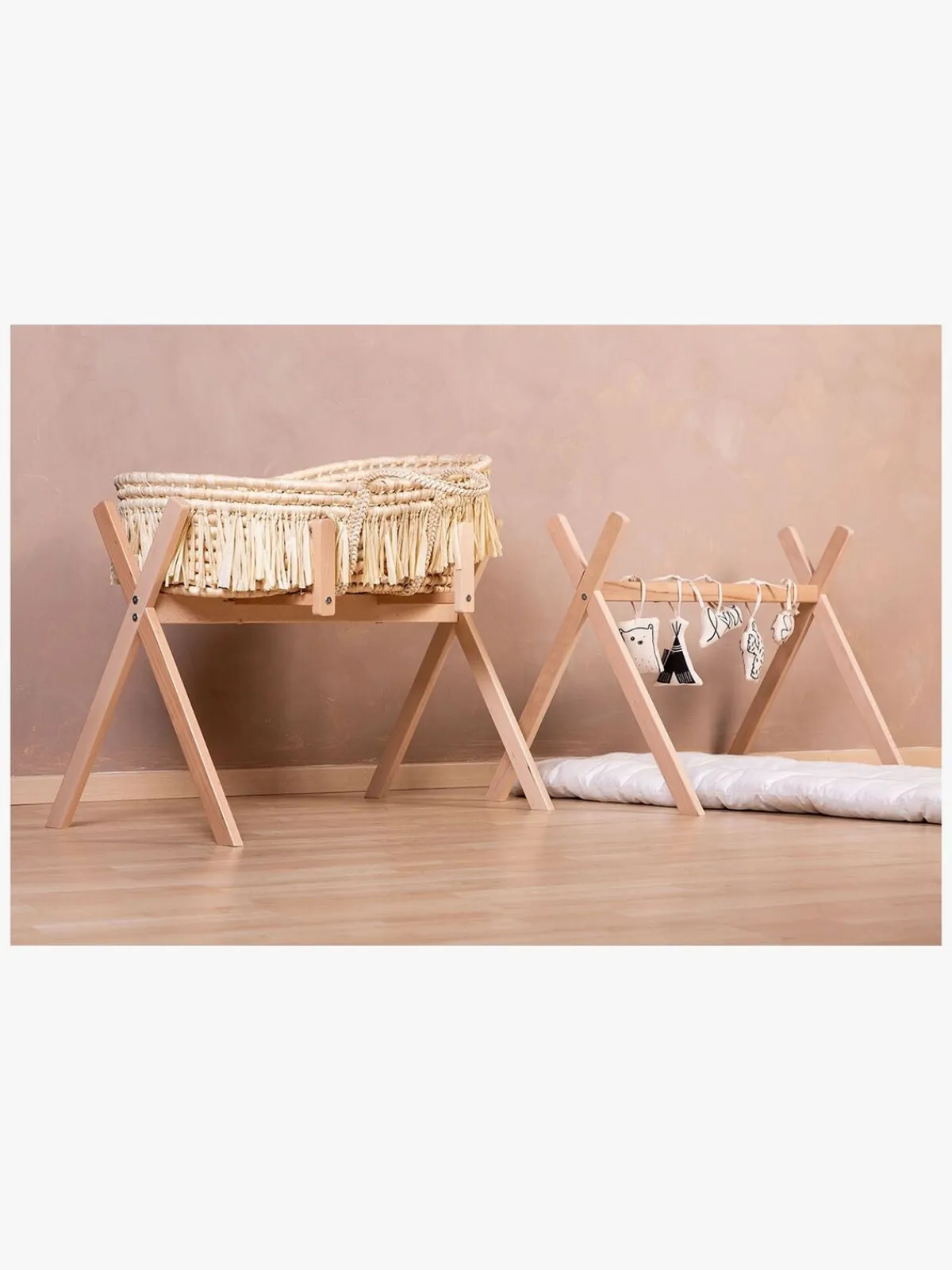 Moseskurv eller legetøj til aktivitetstæppe medfølger ikke.