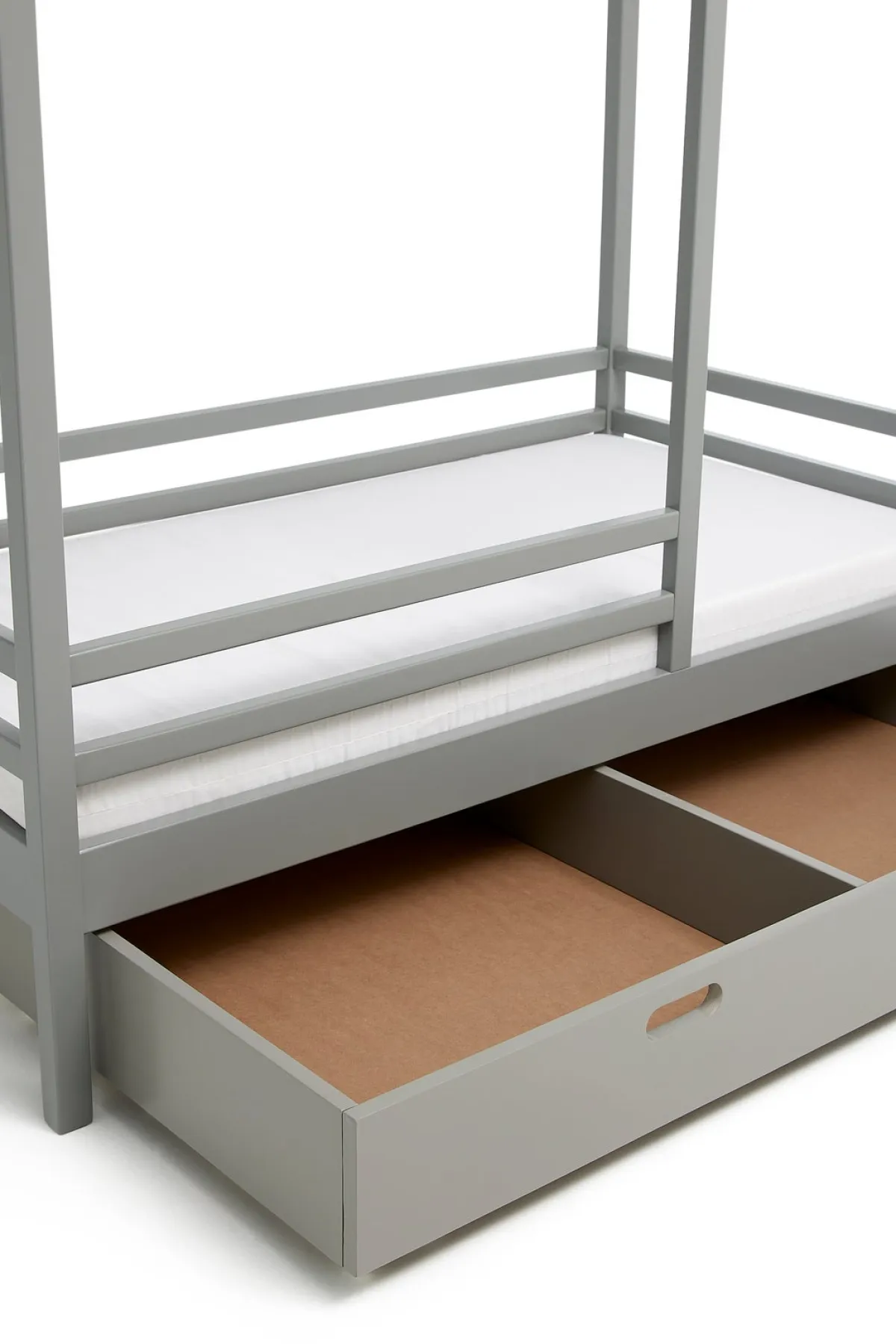 Denne juniorseng har høje sider, bortset fra en lille åbning i fodenden, så dit barn kan sove og lege sikkert. Med i pakken medfølger en matchende sengeskuffe med god opbevaringsplads, der passer perfekt under sengen. Sengeskuffen fra Minitude har letrullende hjul på undersiden for let transport. Den har to håndtag og to store rum med plads til alle barnets yndlingsting.