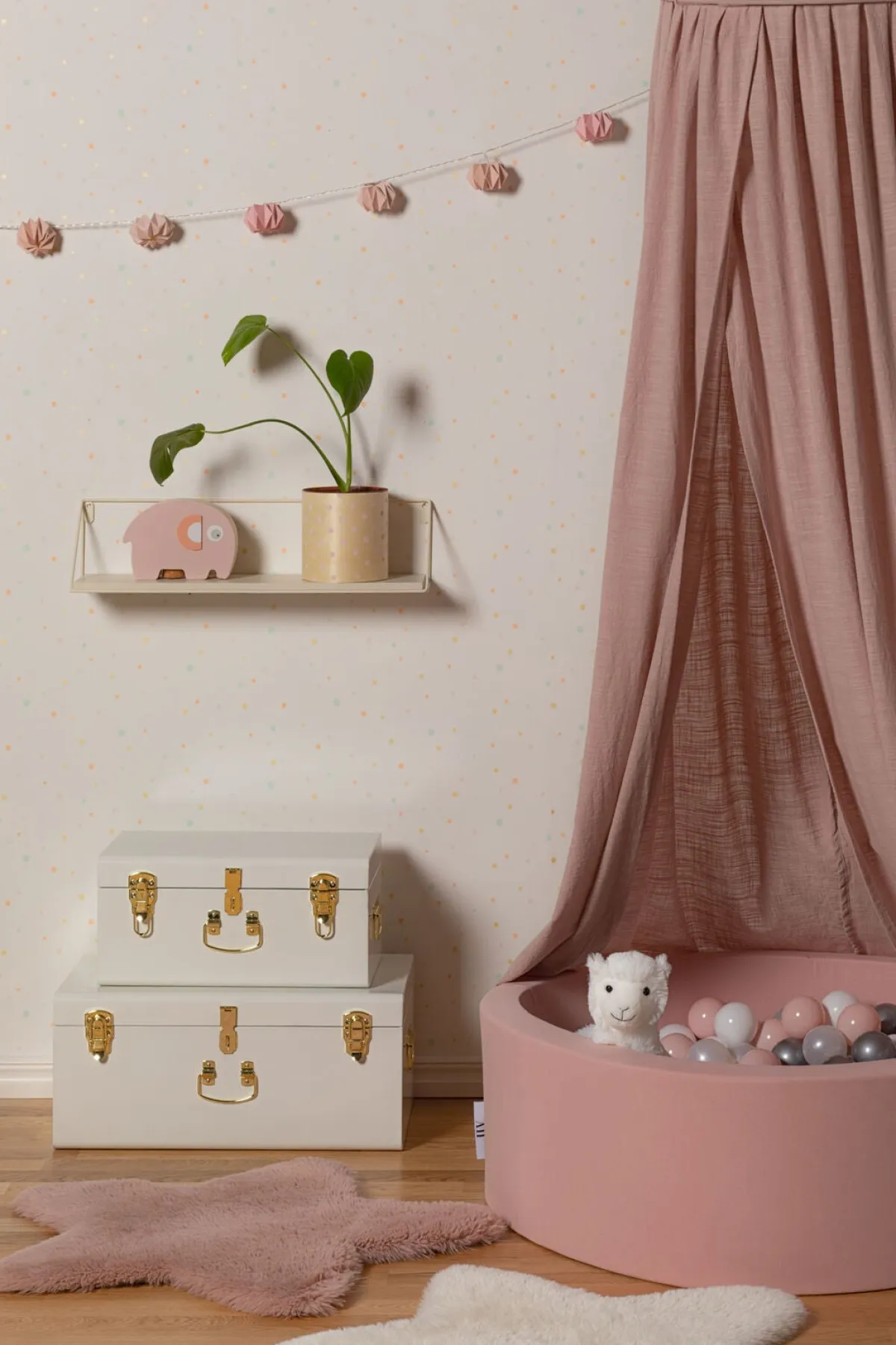 Dette skønne boldbassin er beklædt i blød, Oeko-Tex-certificeret bomuld og er fyldt med 150 bolde, der er fremstillet af giftfri PE-plast. Boldene kommer i farverne hvid, pearl, grå og sølv. Betrækket kan tages af og vaskes i maskinen, så du let kan fjerne pletter, hvis uheldet skulle være ude.