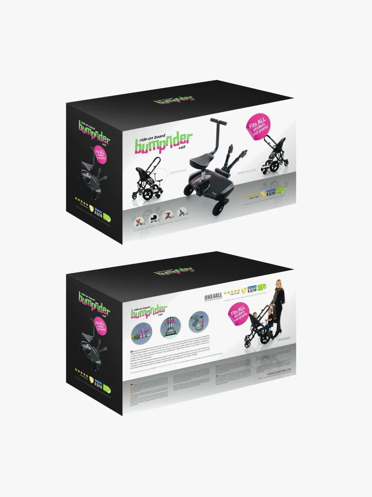 Med Bumpriders smarte ståbræt, kan store søskende følge med på barnevognsturen uden pladsproblemer. Denne nye version har sågar sæde, så dit store barn selv kan vælge om han/hun vil stå eller sidde op på turen, og et praktisk håndtag, der gør det nemt at holde balancen.