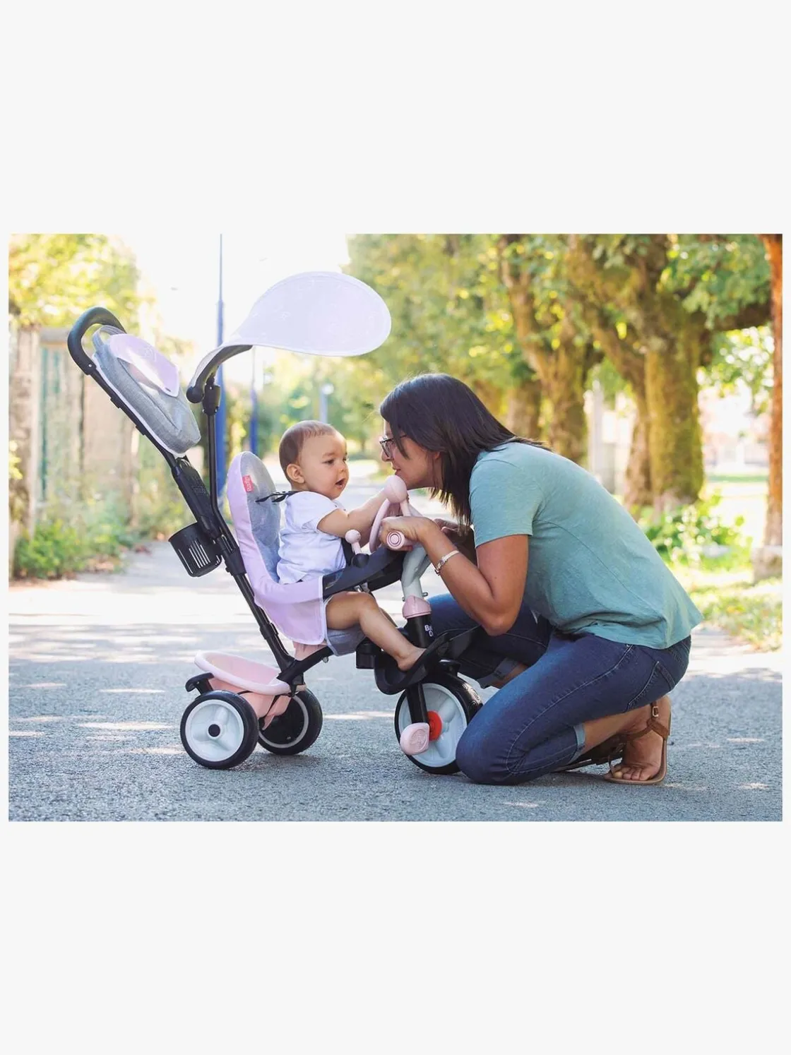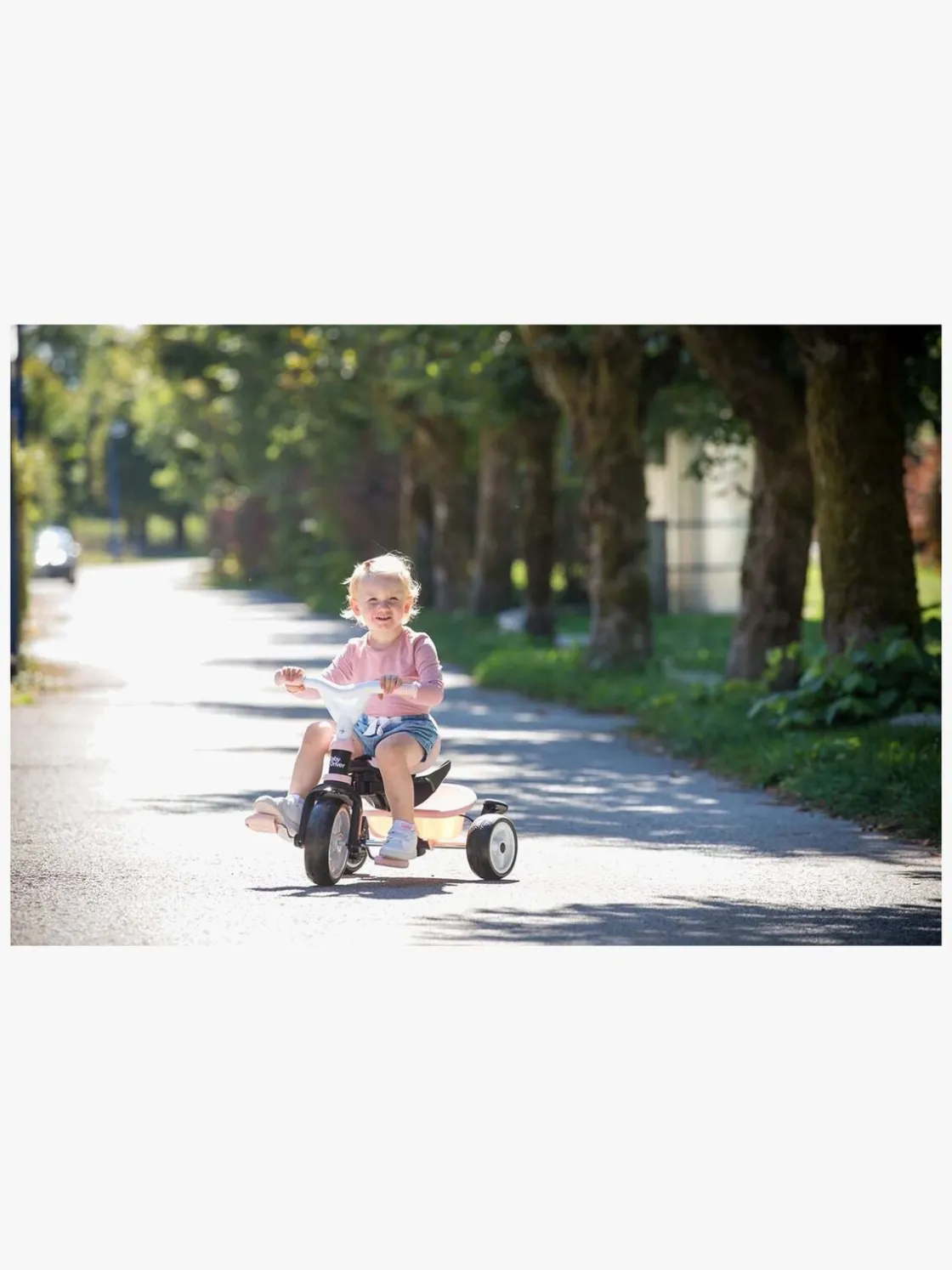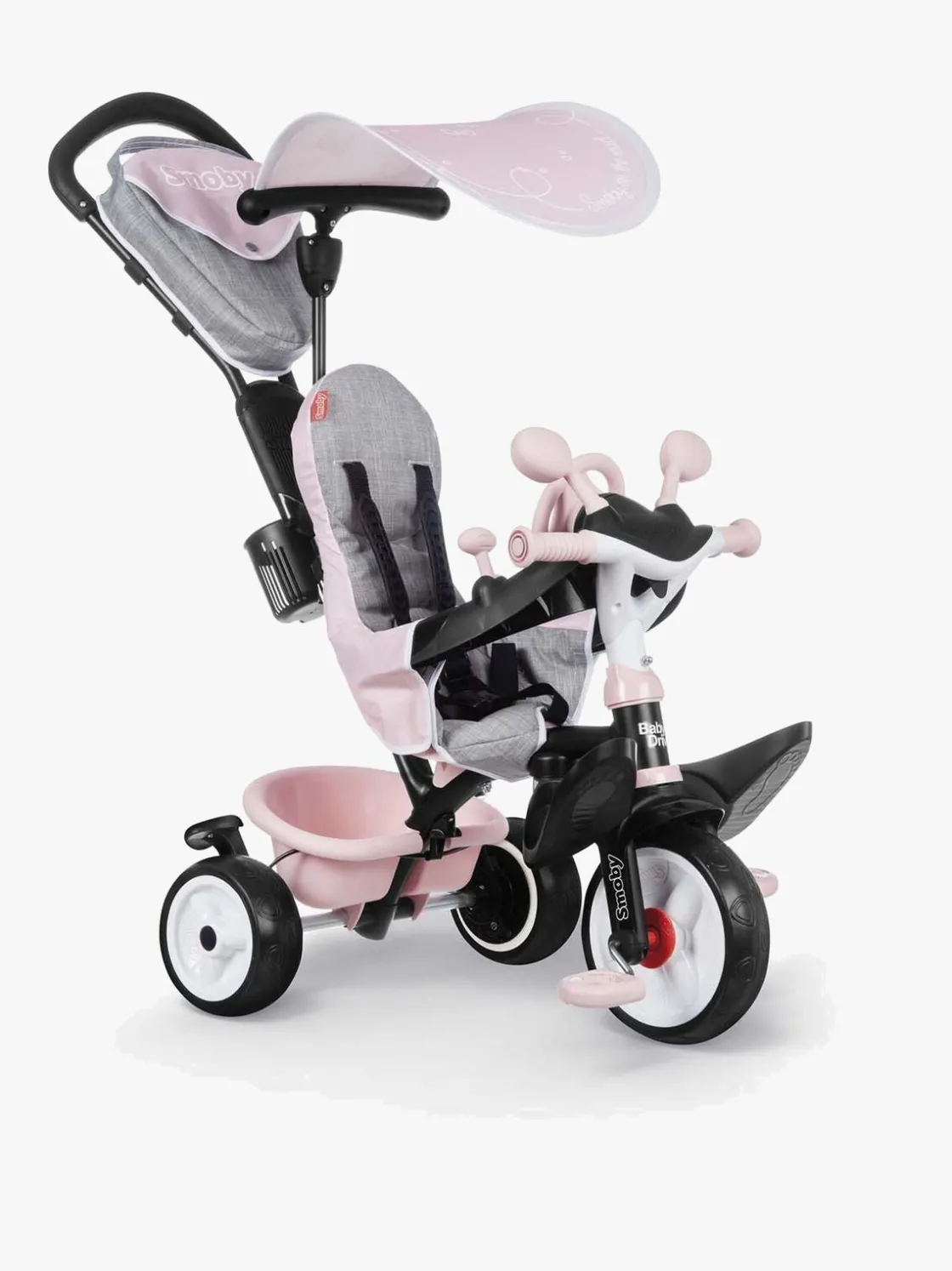 Sædet kan justeres i to forskellige positioner og er forsynet med et behageligt ryglæn, solskærm og en sikkerhedsbøjle, der efterlader god plads til barnets ben. Den trehjulede cykel er også udstyret med et håndtag, som den voksne kan holde i og give lidt ekstra fart, når de små ben er blevet trætte.