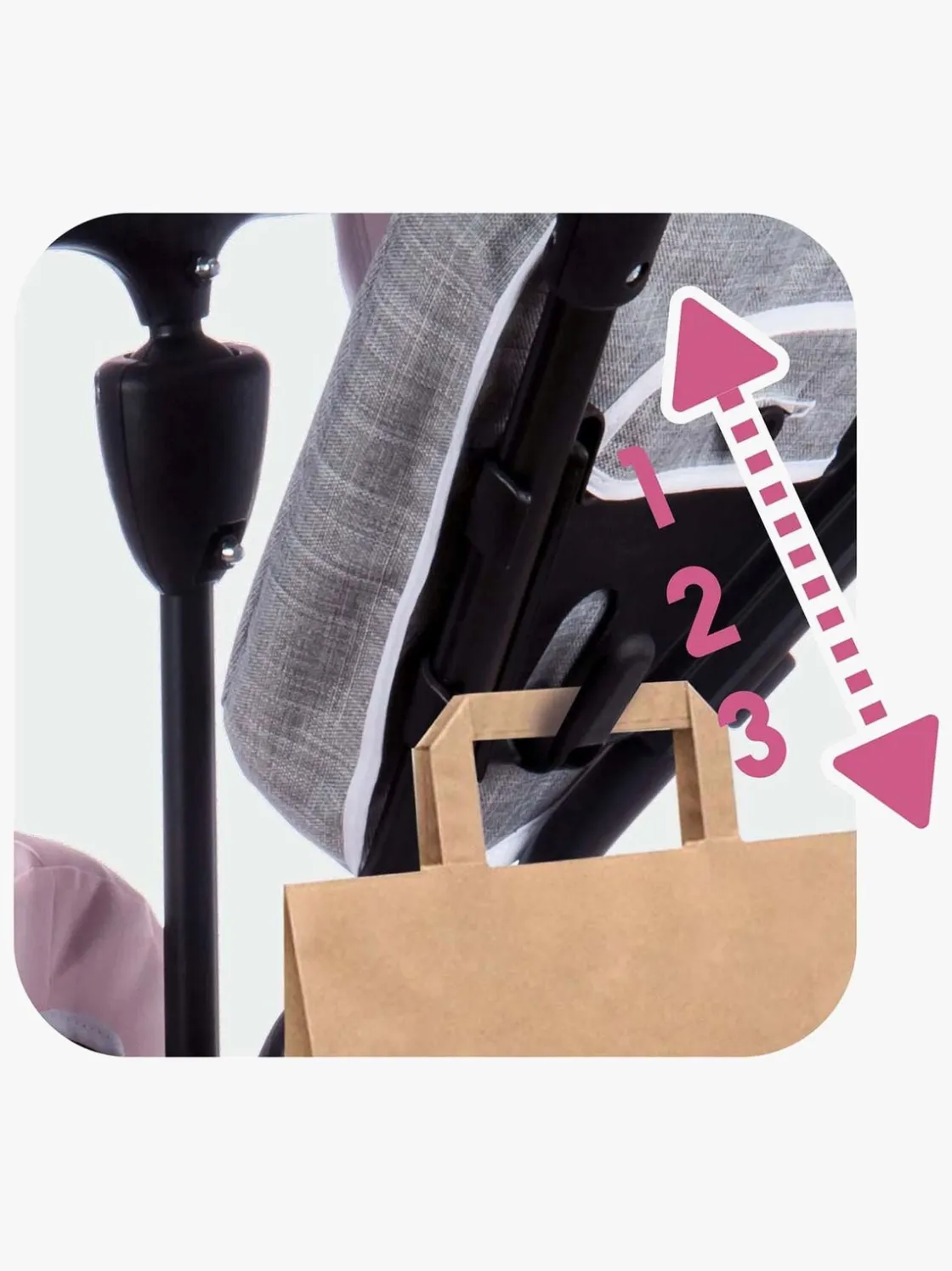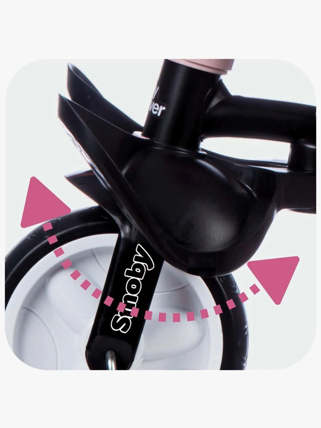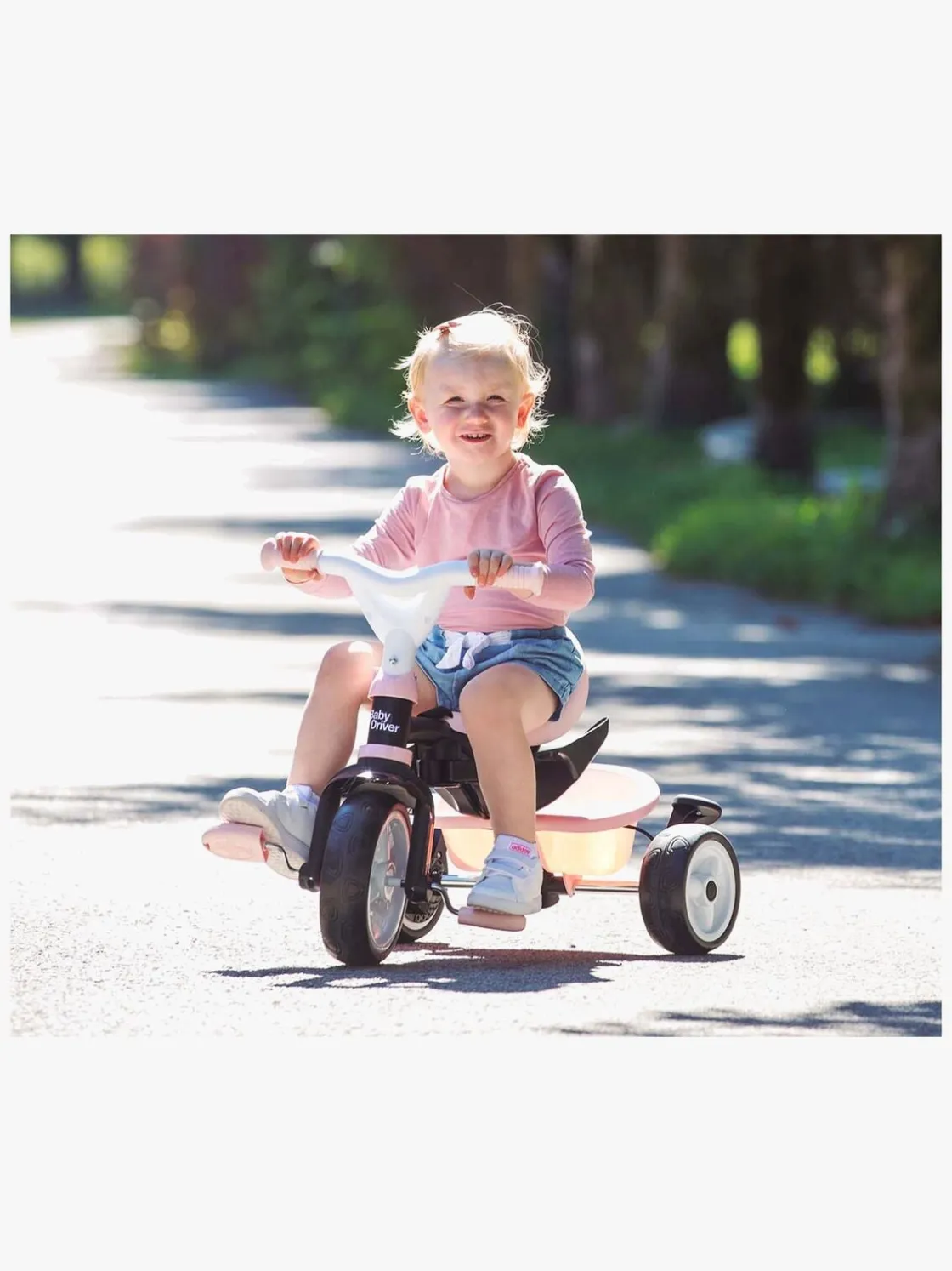 Sædet kan justeres i to forskellige positioner og er forsynet med et behageligt ryglæn, solskærm og en sikkerhedsbøjle, der efterlader god plads til barnets ben. Den trehjulede cykel er også udstyret med et håndtag, som den voksne kan holde i og give lidt ekstra fart, når de små ben er blevet trætte.