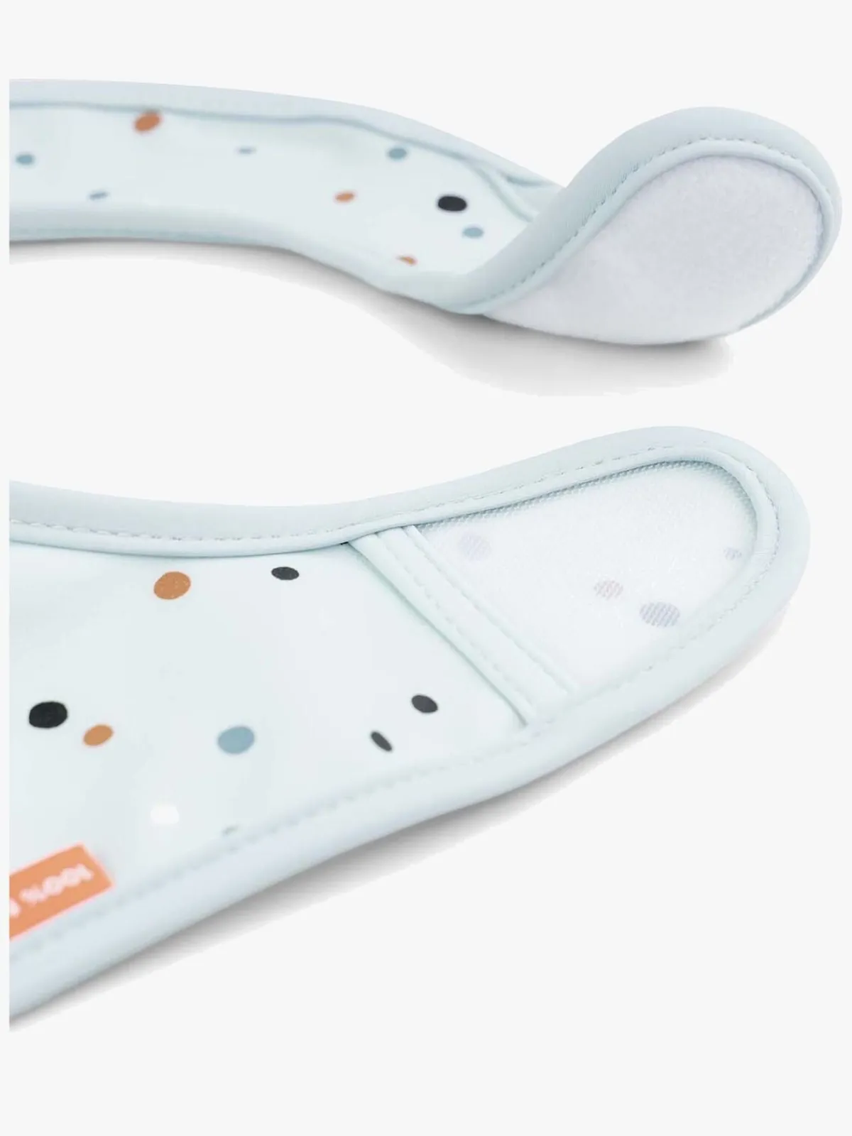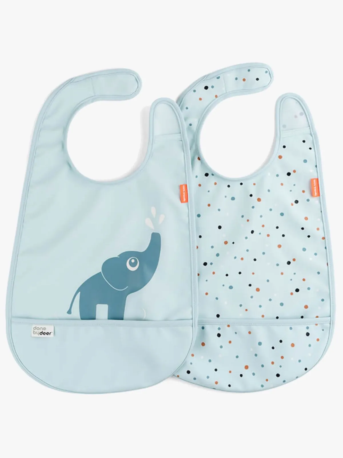 Vandtætte, blå Elphee hagesmække fra Done By Deer med to smukt designede mønstre. De har velcrolukning ved lukningen og smarte lommer foran. Hagesmækkene er fremstillet af et materiale, der er let at rengøre af polyester og med PU-belægning.